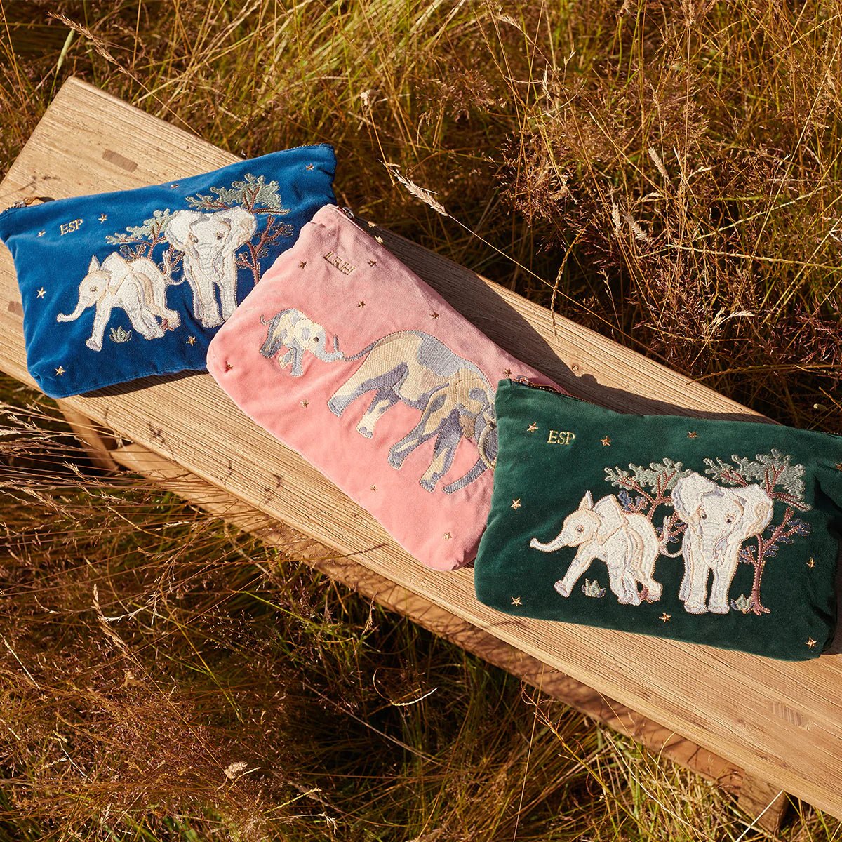 Organise your essentials in luxury with the Elizabeth Scarlett everyday pouch. Crafted from soft, durable coral pink velvet, this pouch features intricate embroidery of mother and baby elephants and gold stars. Perfect for fitting in your handbag or using as a clutch, it adds a touch of elegance to your daily routine.