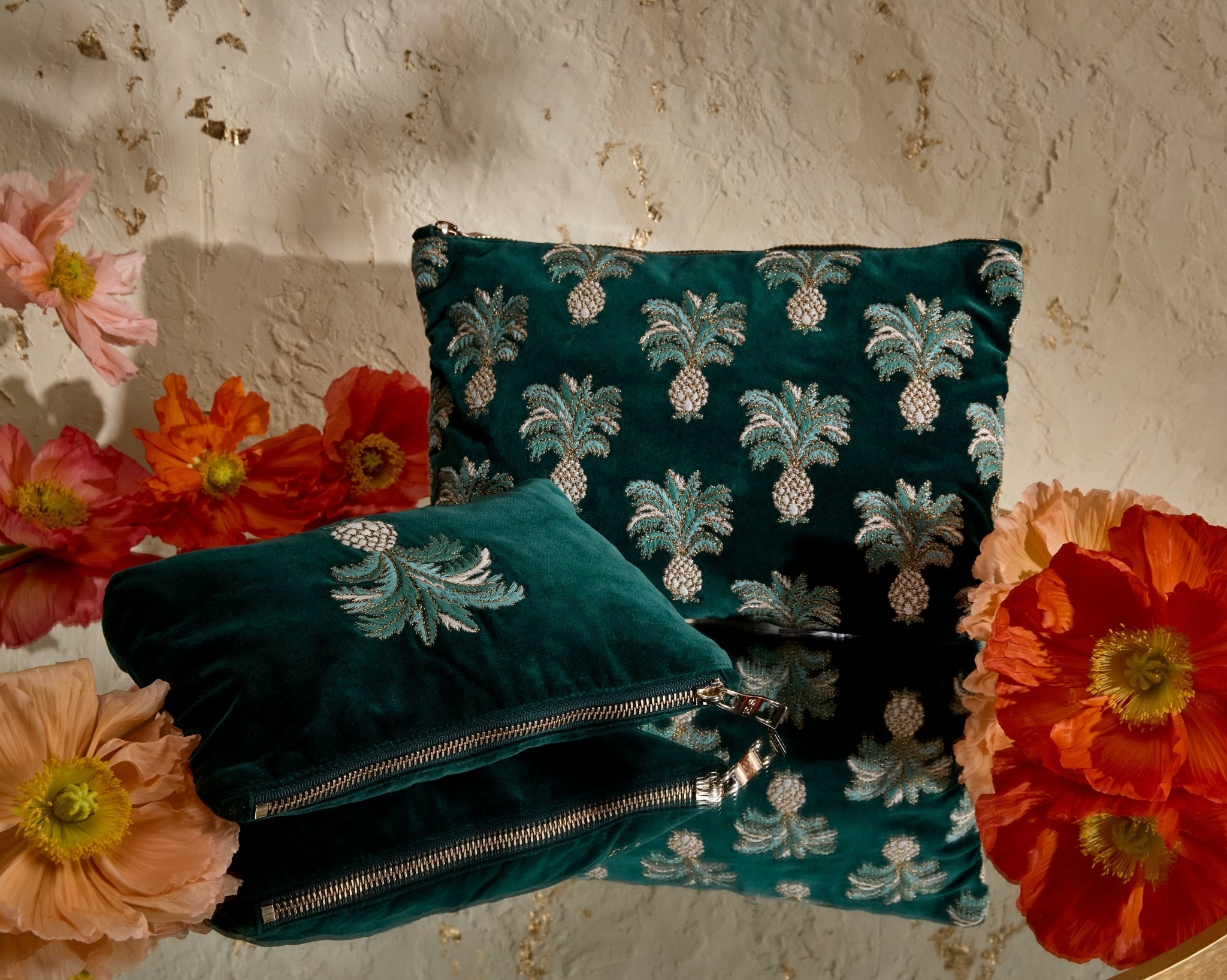 Gift yourself or a loved one with the exquisite Elizabeth Scarlett emerald green everyday pouch. Delicately embroidered on a durable yet soft velvet base, this versatile bag is ideal for keeping daily essentials organised in style. The pineapple design symbolises celebration and good luck, making it a perfect gift for all occasions.