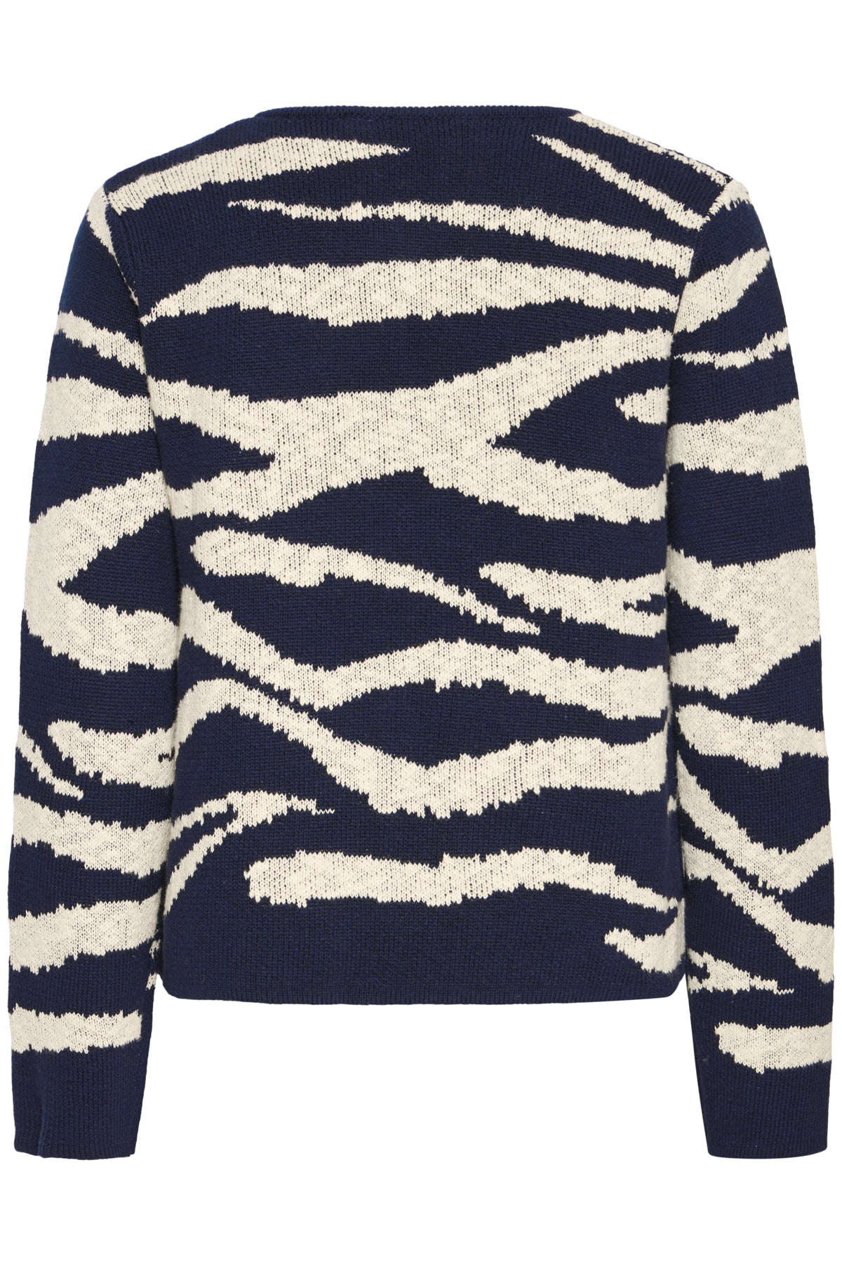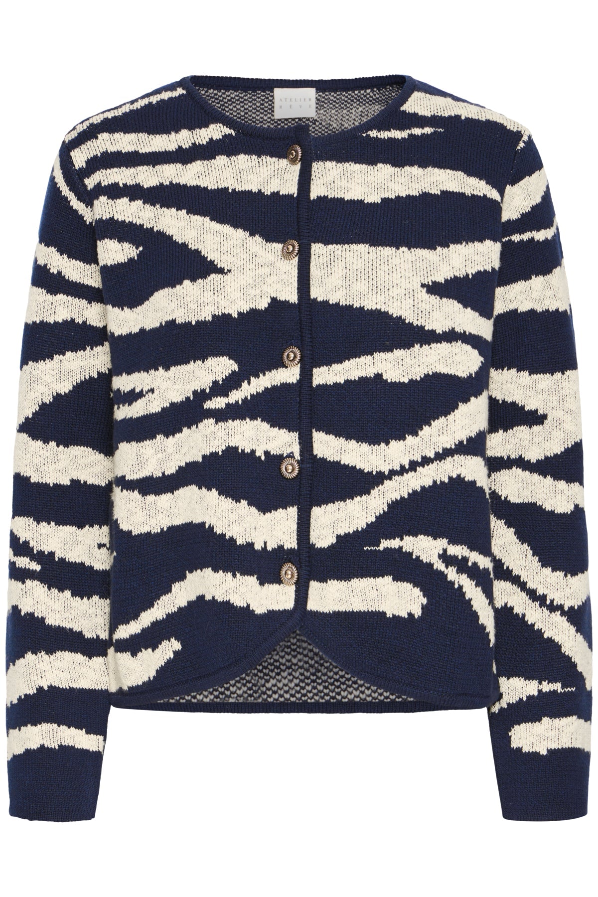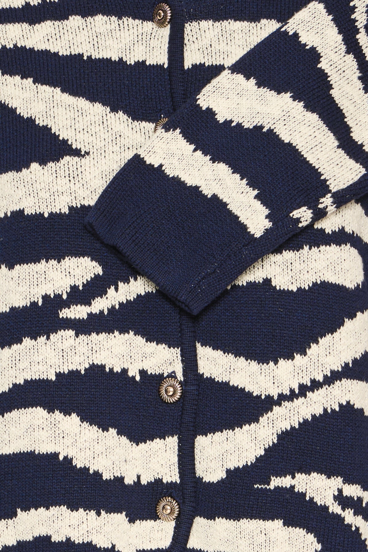 This navy blue and ecru cardigan features a bold zebra print design with a unique curved hemline leading to a buttoned front. Its round neck and stylish metal buttons enhance its easy, comfortable fit. Perfect for layering over jeans or dressing up with a blouse and skirt, it pairs beautifully with a lightweight scarf for a polished look.