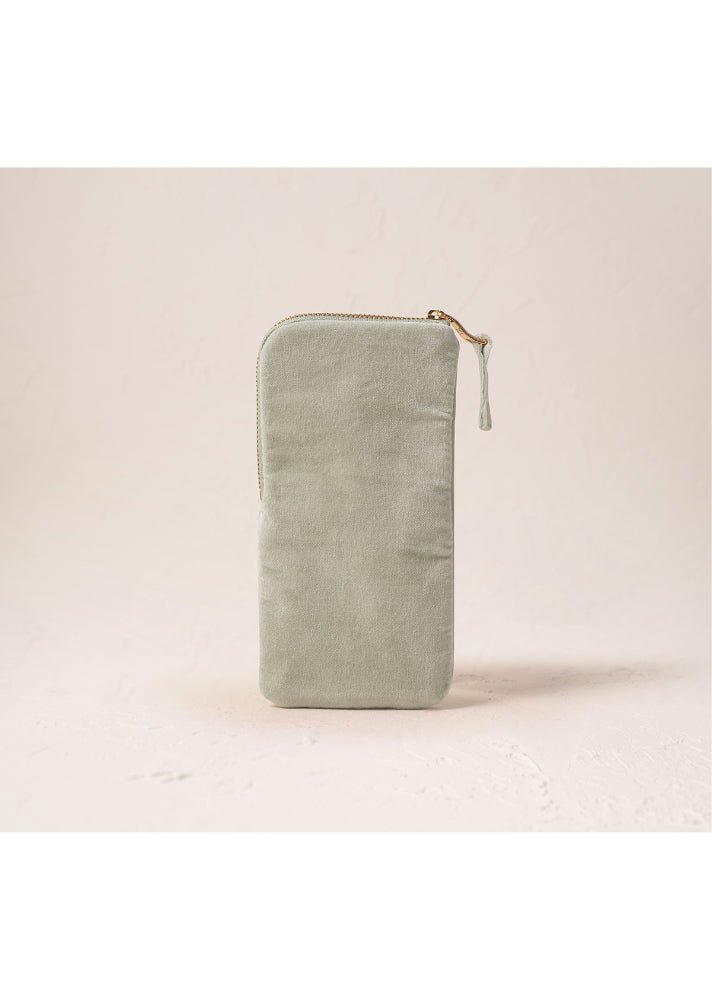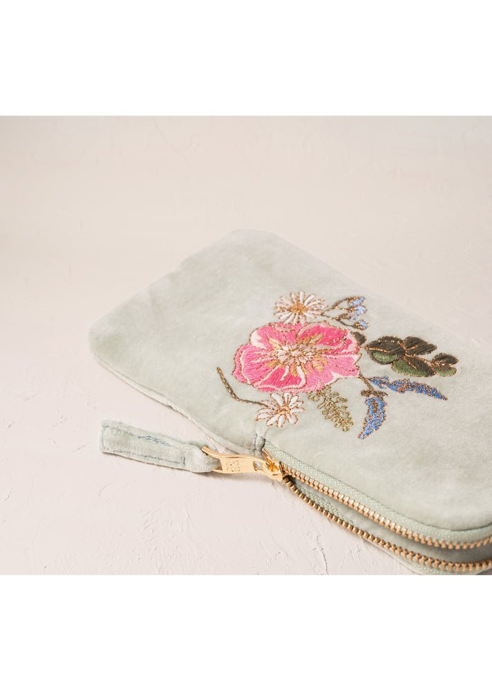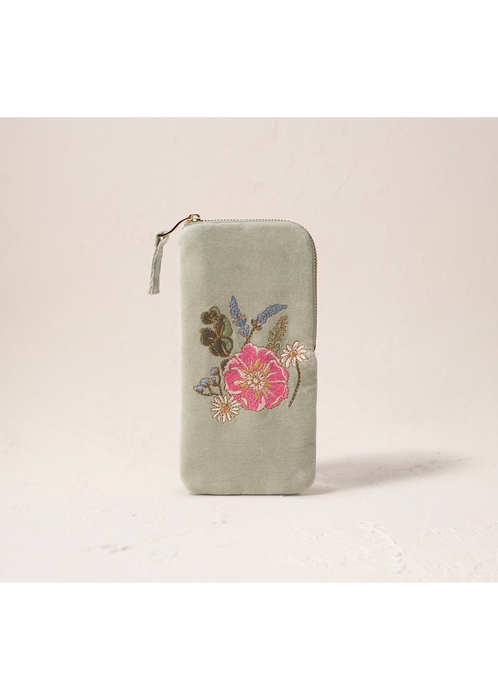 Protect your sunglasses in style with this beautiful Elizabeth Scarlett glasses case. Handcrafted from premium 100% cotton velvet in a soft sage green, it features delicate pressed flower embroidery inspired by British countryside blooms. The stiffened, padded construction and plush velvet lining safeguard your lenses from scratches, while the convenient gold zip closure ensures easy access. It's the perfect compact companion for travel or daily wear.