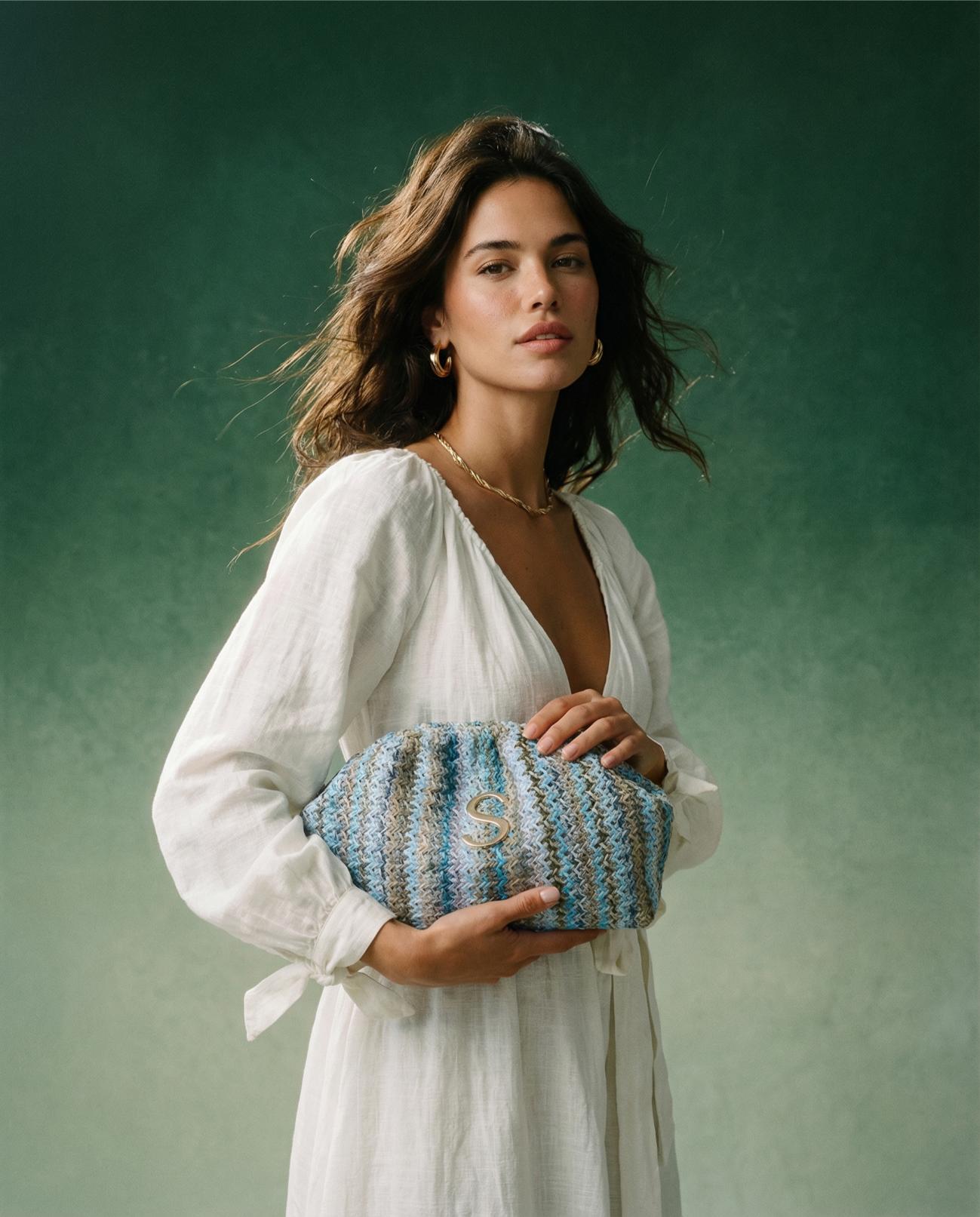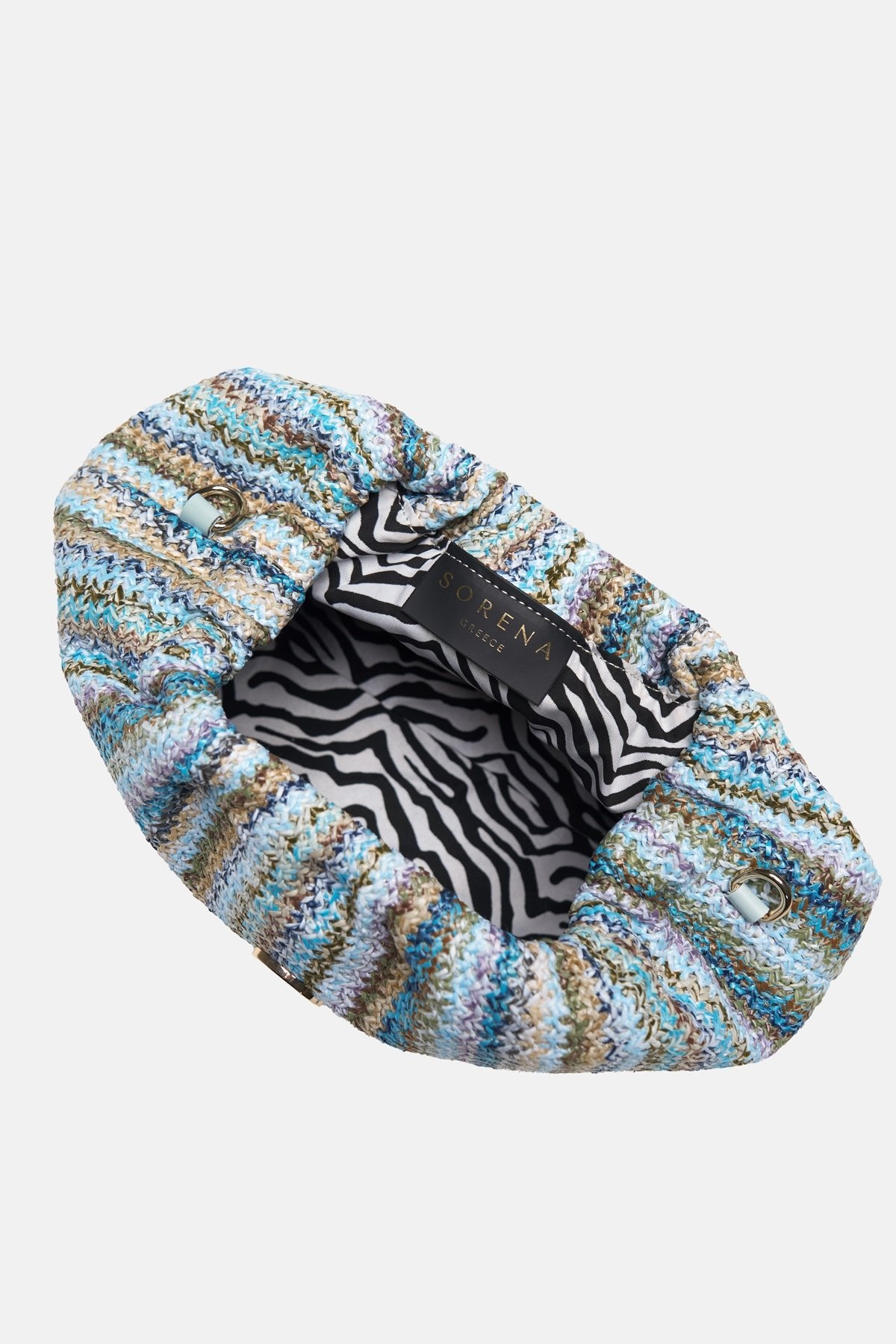The Sorena large bucket bag, Elafonisos, combines Mediterranean charm with everyday practicality. Crafted from premium straw fabric with a subtle striped pattern, this shoulder bag features a magnetic frame closure, gold-tone logo detailing, and a removable chain strap for versatile styling. Made in Greece from 100% cotton with a fabric lining, it's the perfect blend of lightweight elegance and luxurious, timeless design.
