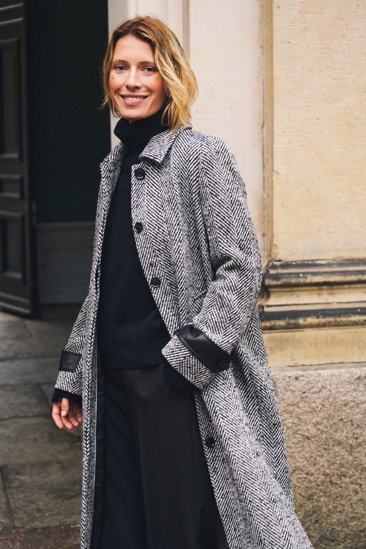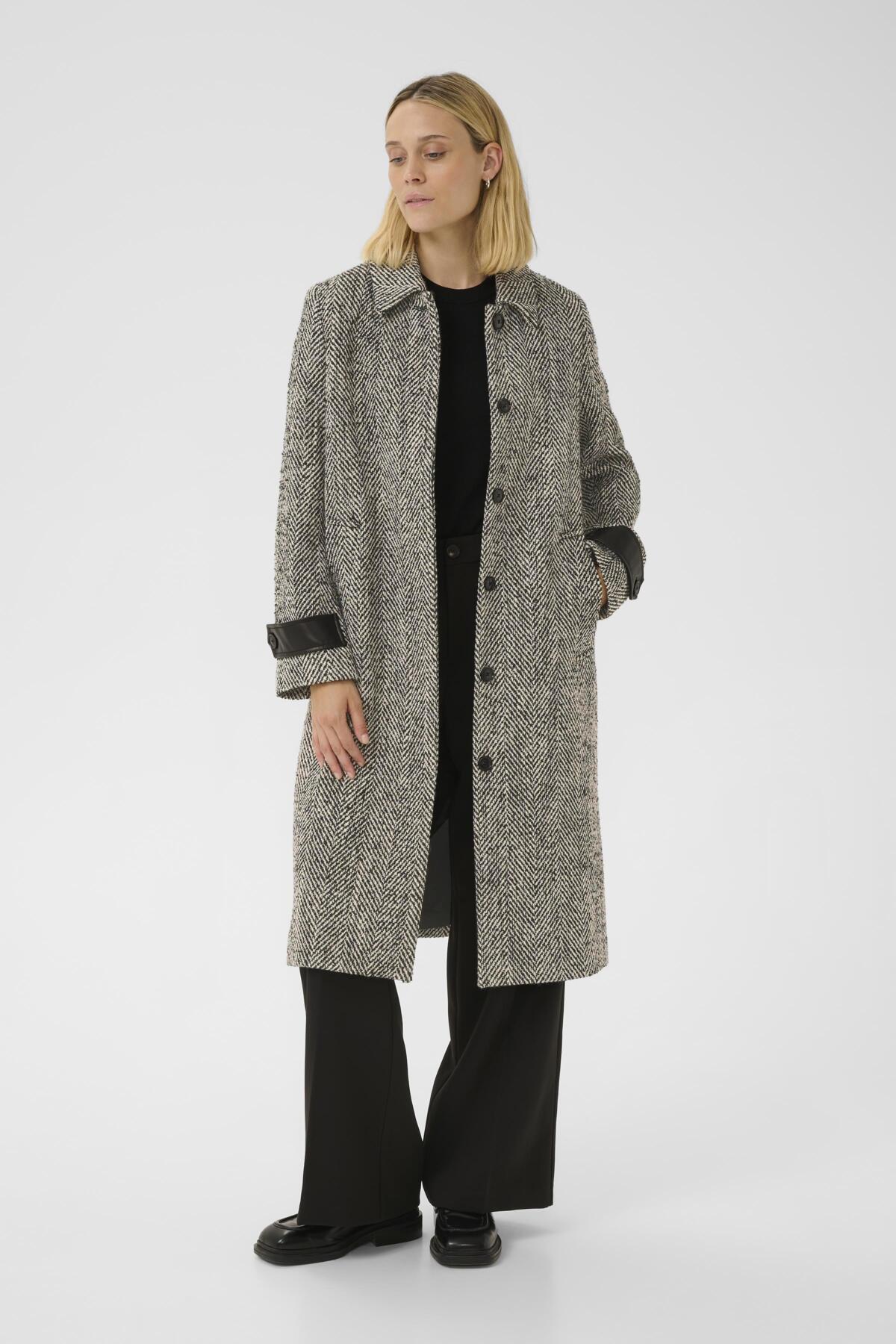 This elegant grey wool coat showcases a timeless herringbone pattern and a streamlined straight silhouette complemented by a classic collar. Leather trimmed cuffs add a refined detail to its modern mid length design. Versatile enough to elevate smart separates or effortlessly enhance a casual jeans and t-shirt look, this coat is your perfect companion for stylish warmth throughout the colder seasons.