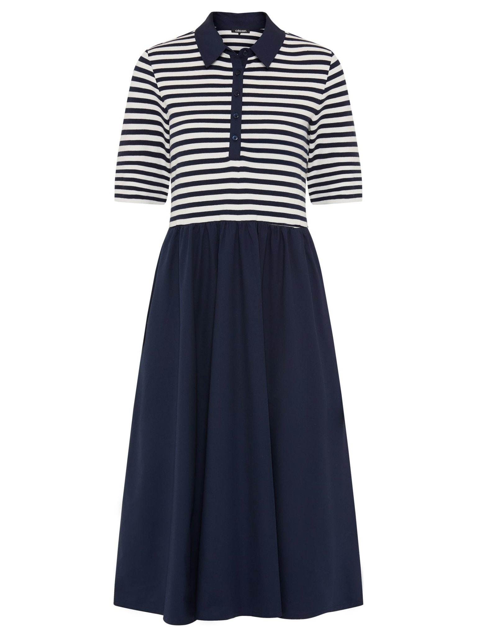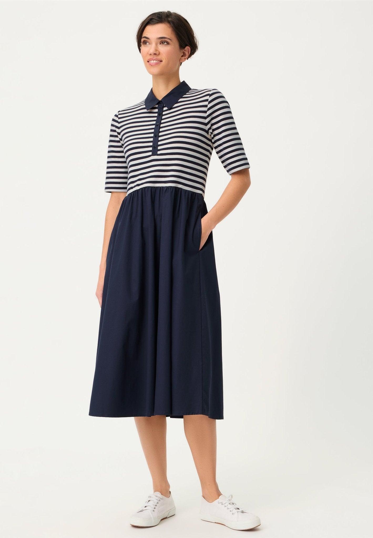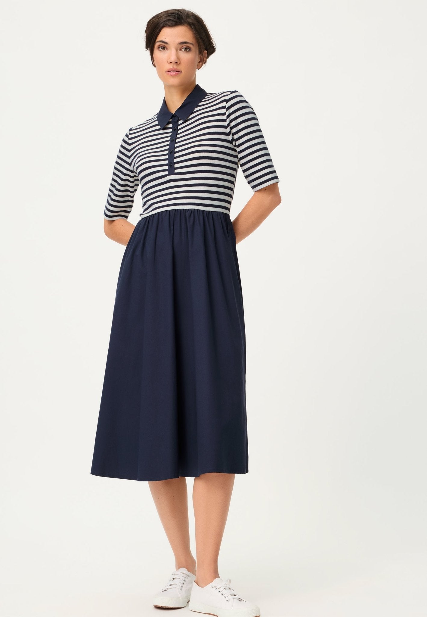 Effortlessly chic, this striped dress combines a crisp poplin skirt with a relaxed cotton-elastane blend top featuring a classic shirt collar. Three-quarter sleeves with elasticated cuffs add contemporary polish to the feminine silhouette. The modern, fresh design transitions seamlessly from casual to smart—pair with sandals for weekend ease or trainers for an understated vibe. A versatile wardrobe essential that delivers comfort without compromising on style.