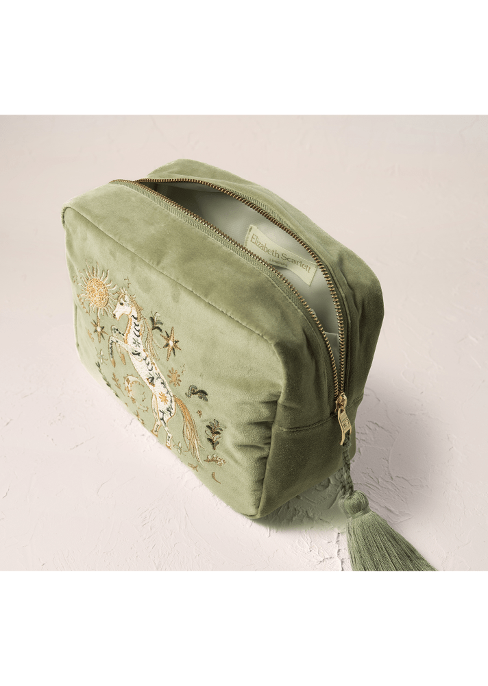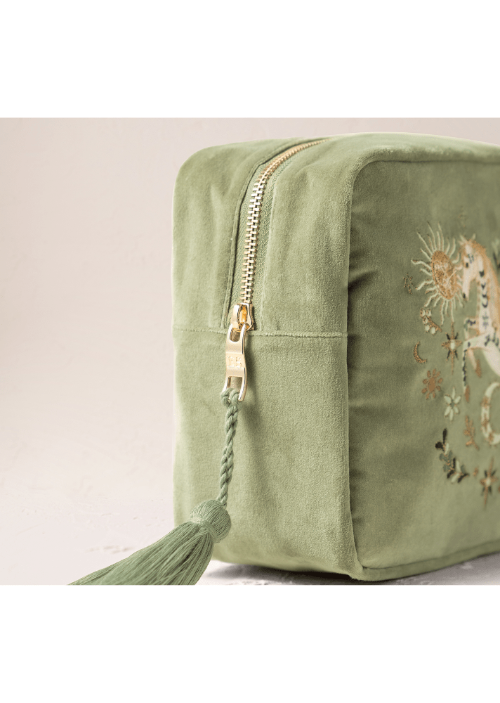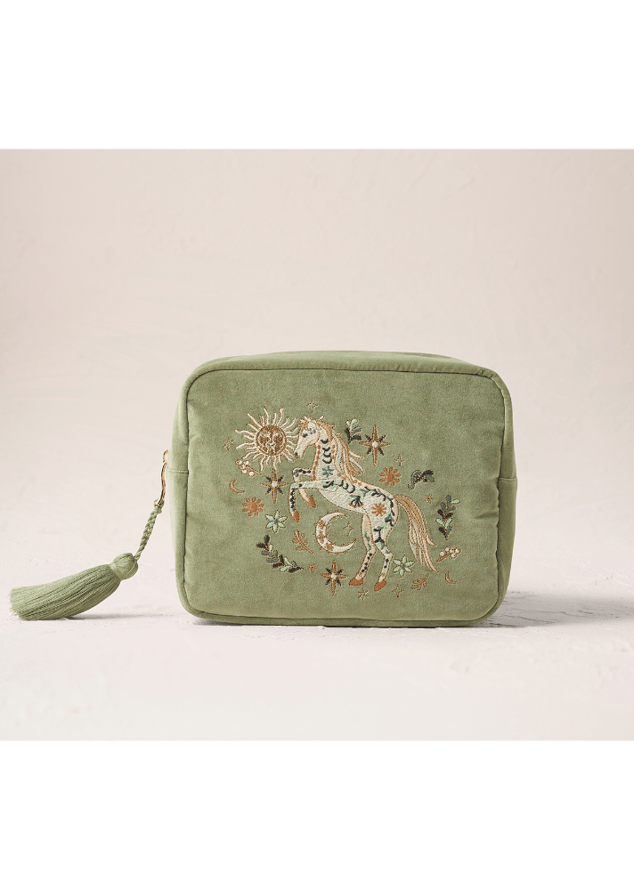 Transform your daily beauty routine with this captivating wash bag, where mystical horses gallop beneath starlit skies and seasonal blooms. Crafted from luxurious khaki velvet with intricate embroidery details, it brings an air of enchantment to your self-care rituals. The waterproof lining safeguards your products, whilst convenient inner pockets and a refined zip tassel keep everything organised and accessible. Whether nestled on your bathroom shelf or displayed on your dressing table, this piece celebrates the idea that functional items deserve to be beautiful too.