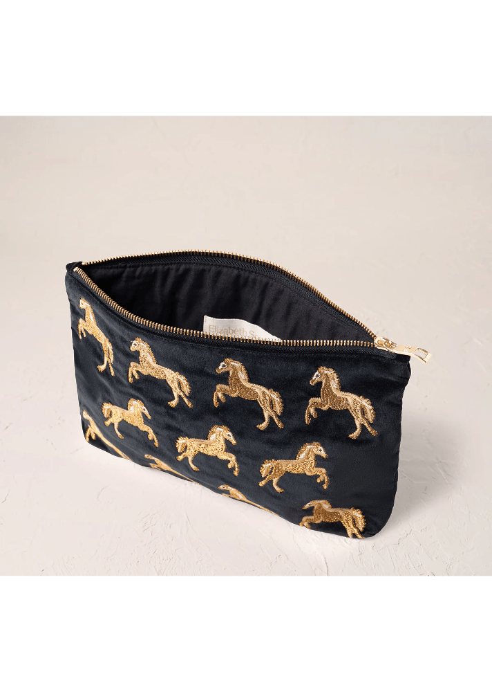 Inspired by wild horses from myth and Irish folklore, this Elizabeth Scarlett pouch captures untamed spirit with stunning gold thread embroidery on sumptuous charcoal velvet. Perfectly proportioned for everyday essentials, it slides effortlessly into your handbag or stands alone as an elegant clutch. A luxurious touch that celebrates your free-spirited nature while keeping life beautifully organised.