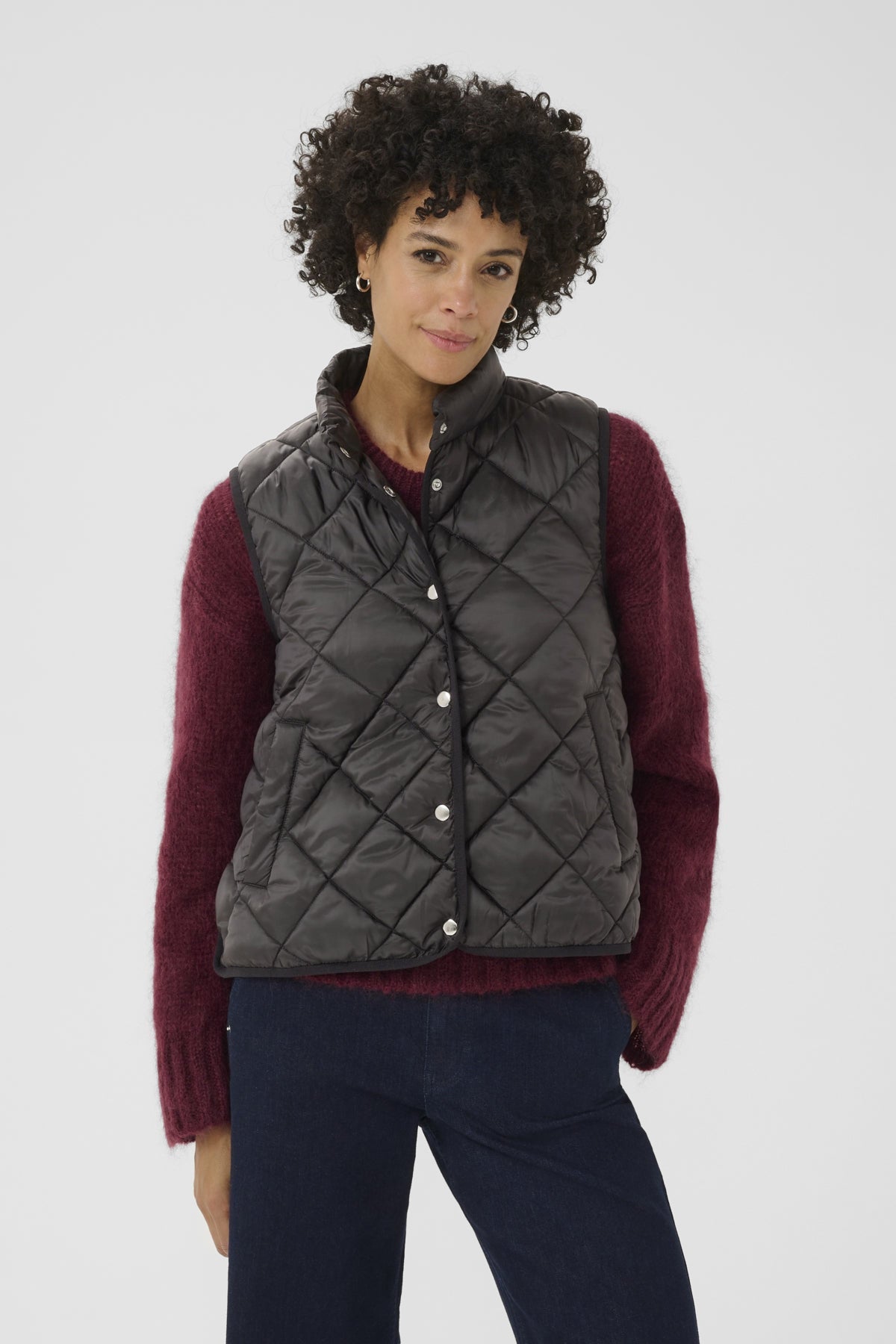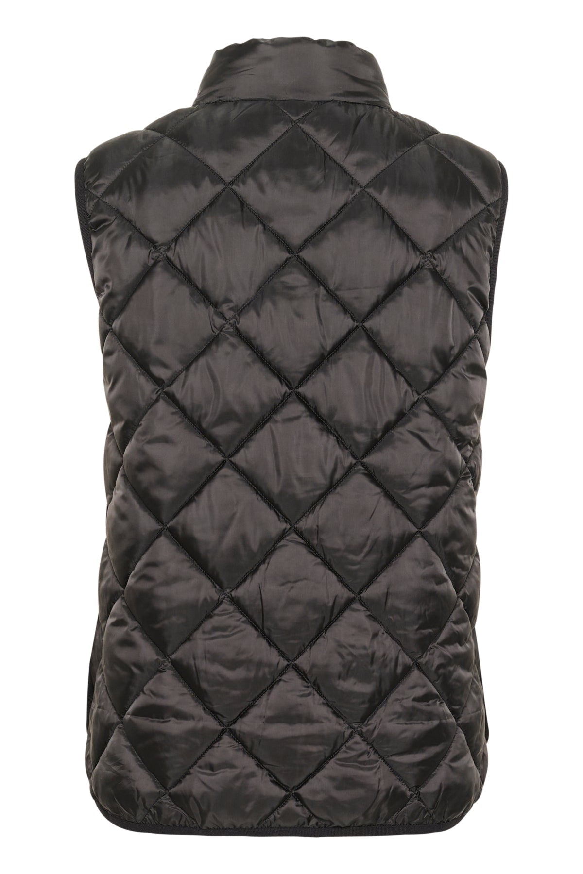 This black quilted vest is an ideal layering piece for transitional weather. Crafted from quilted fabric with a high collar and press-stud fastening, it provides lightweight warmth and comfort. Easily worn over knits and tops or smoothly layered under a coat, it offers versatile protection against changing temperatures.