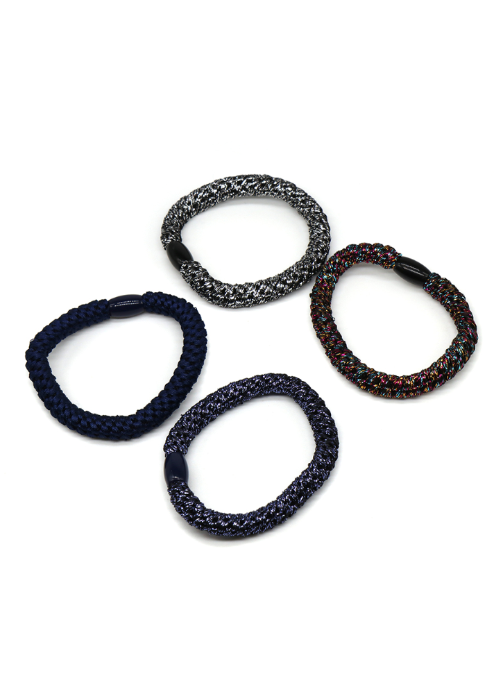 Discover effortless style with these POM hairbands. This charming set brings together 4 elasticated hairbands in navy, metallic, and multi-coloured finishes, each enhanced with eye-catching glitter thread accents. They're ideal for keeping your hair neatly secured throughout the day or gifting to someone who loves a pop of sparkle. Switch up your look with minimal effort.