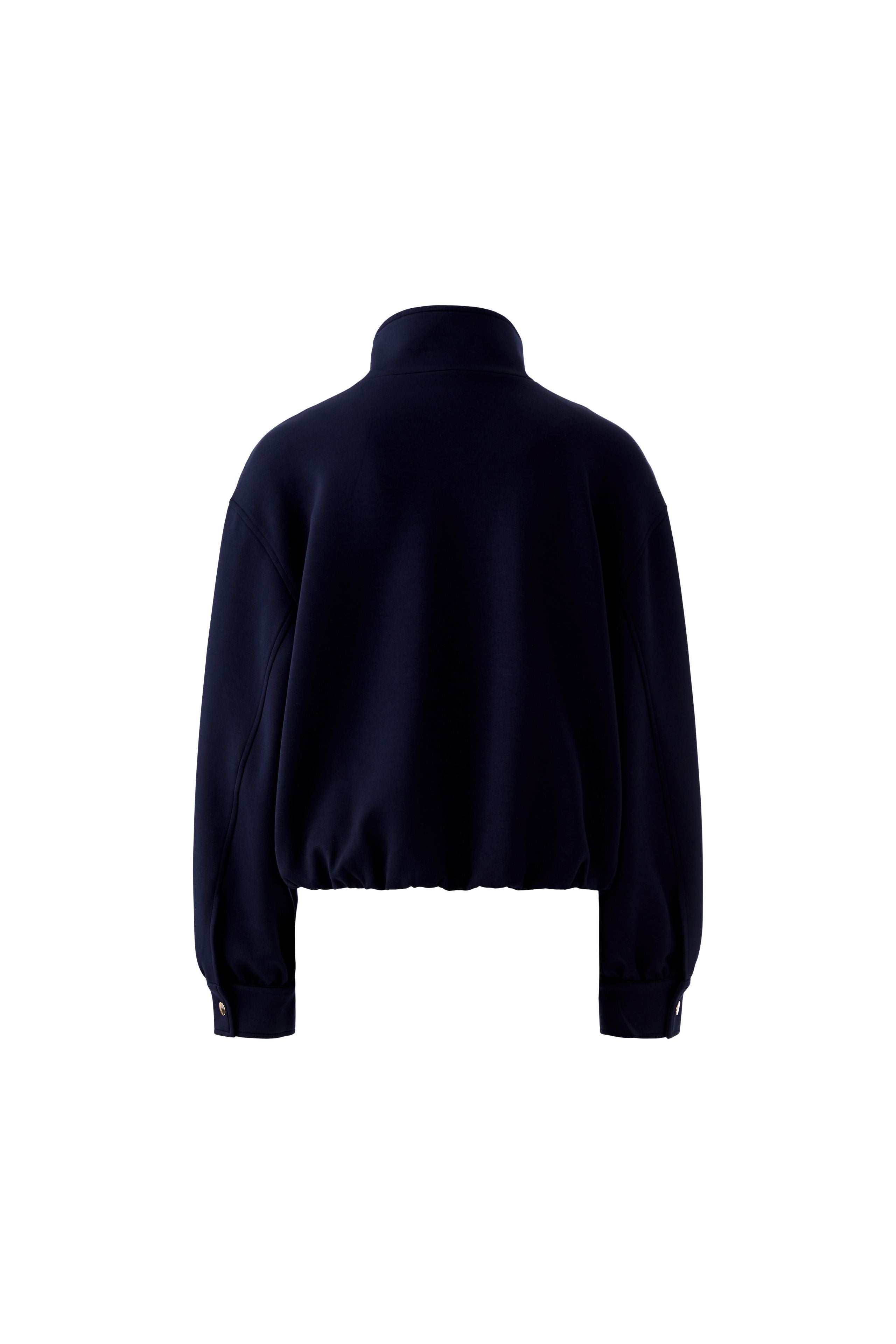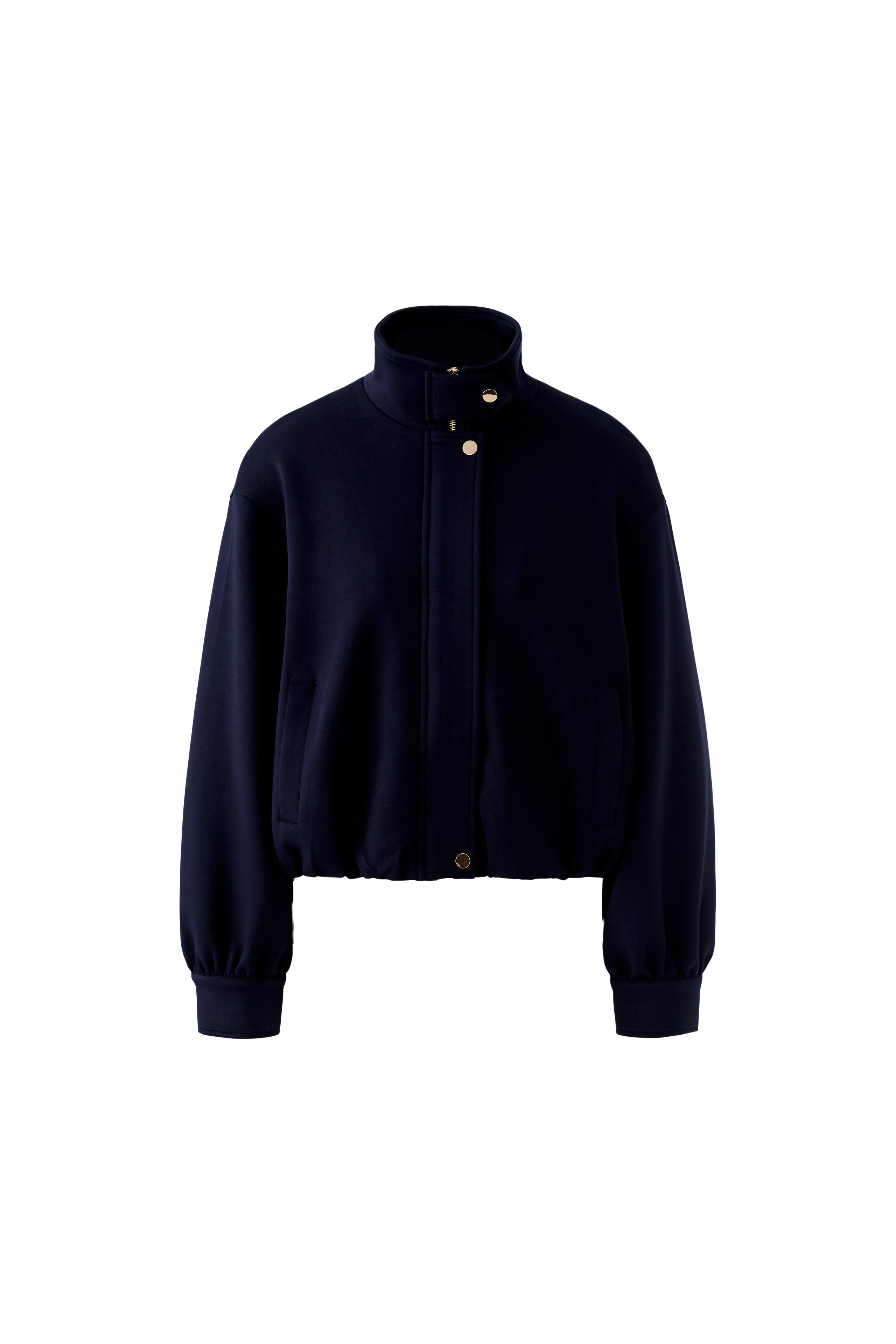 Make a statement with this sophisticated Oui bomber jacket in rich navy blue. Designed from a premium jersey blend, it combines comfort with contemporary style through its distinctive high neckline, polished gold-tone accents, and refined tailoring. The enclosed zip front, elasticated hem, and practical front pockets make it as functional as it is fashionable. Perfect for layering over basics or knitwear, this versatile piece transitions seamlessly from casual weekends to relaxed weekday styling.