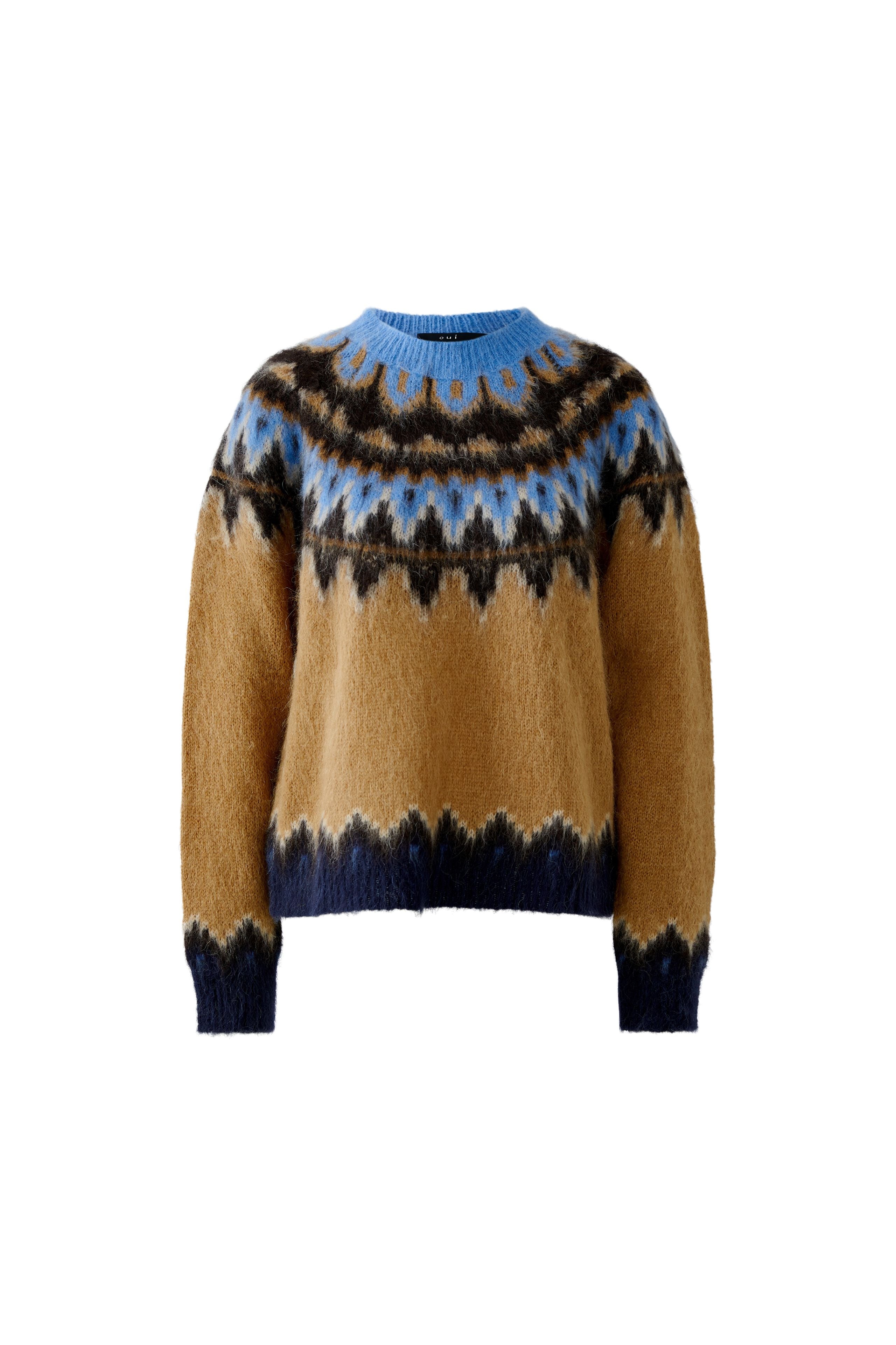 This jumper features a stylish Norwegian patterned yolk in a comfortable raglan design, crafted with soft alpaca wool in a fashionable brown and blue color combo. Finished with rib knit edges, it offers both warmth and timeless style. Pair it with jeans and a cosy coat for effortless winter comfort.