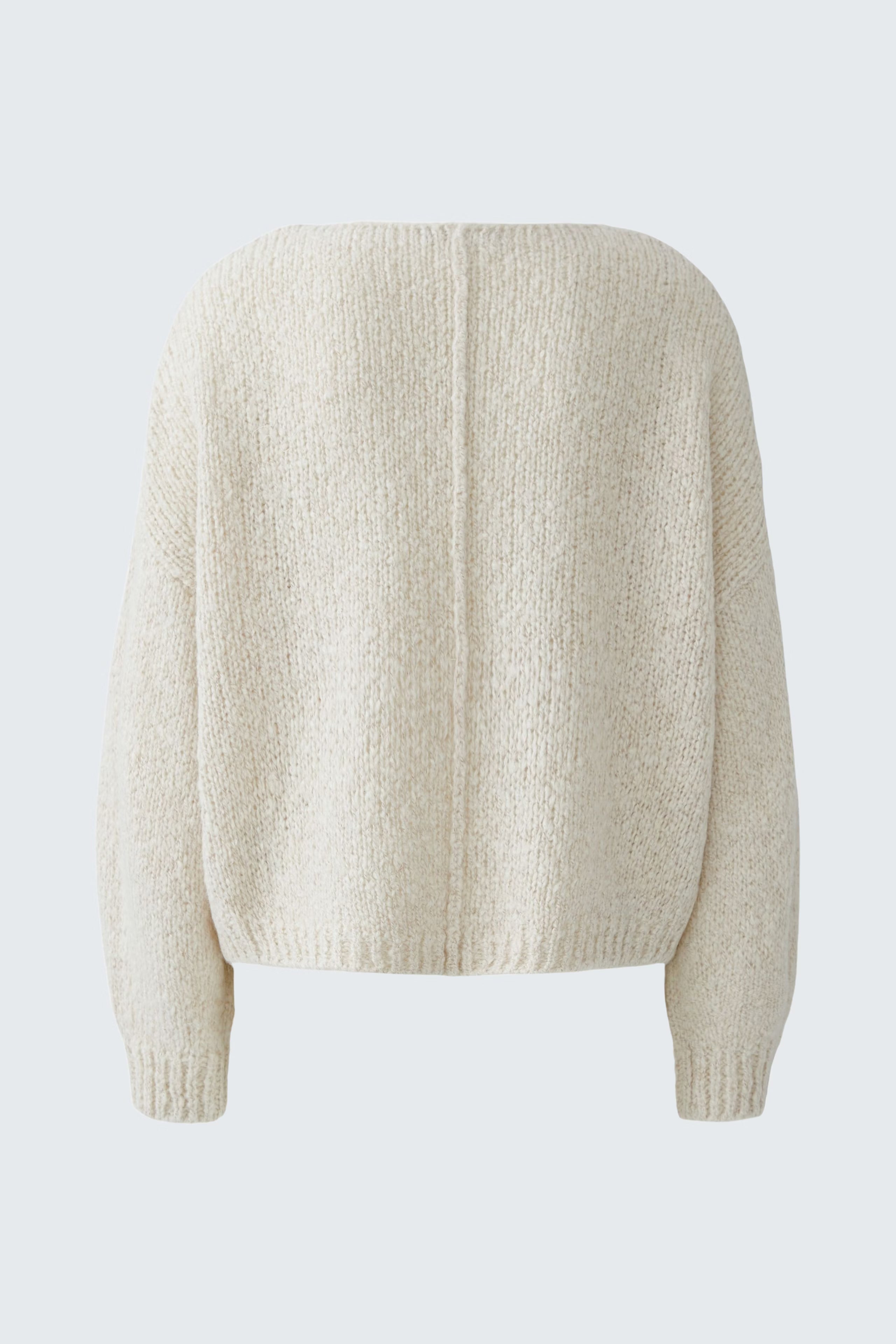 This Oui jumper in a beige melange colour offers a super cuddly feel with a smoothly knitted style in a wool and mohair blend. Its oversized cut and shortened length create a modern silhouette, while dropped shoulders and a clean boat neckline add relaxed elegance. A decorative outer seam on the back centre adds unique detail. An ideal base for statement jewellery and scarves, this knit is perfect for versatile, cosy styling that supports your everyday wardrobe needs.