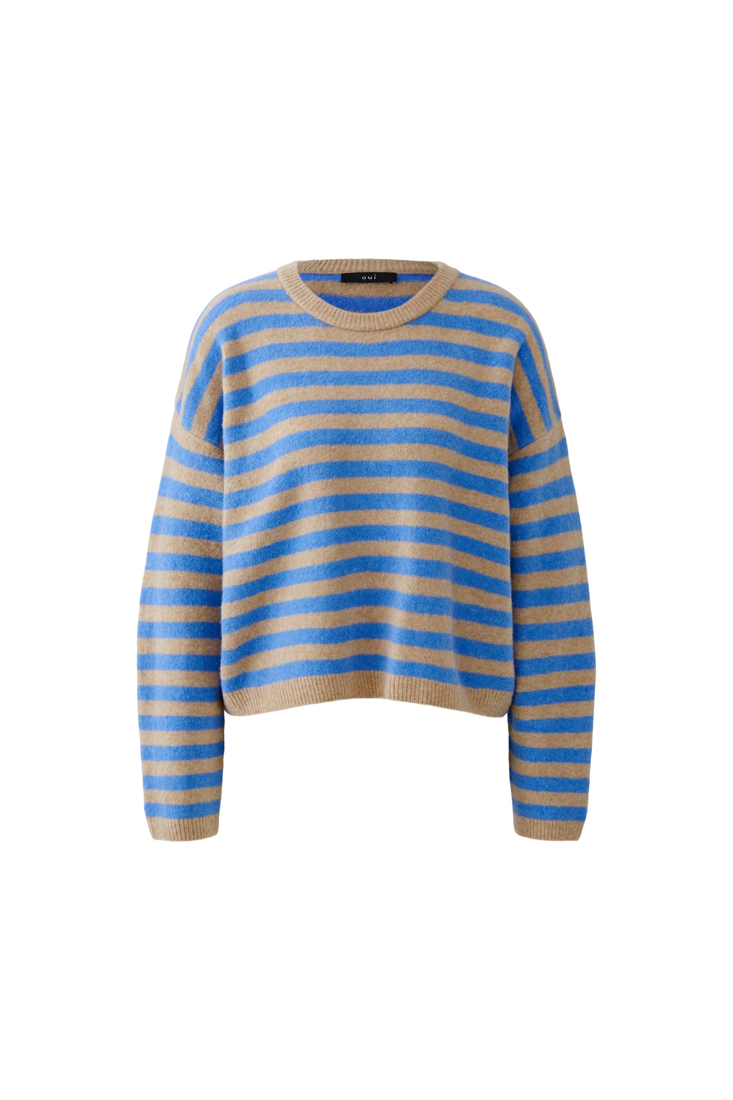Experience cosy comfort with this super soft Oui pullover, featuring a modern oversized, cropped fit crafted from cuddly wool blend yarn. Designed with a round neck, dropped shoulders, and relaxed long sleeves, it offers effortless style and warmth. The double knitted cuffs and short ribbed hems add subtle detail, making it perfect for relaxed weekends and laid-back days.