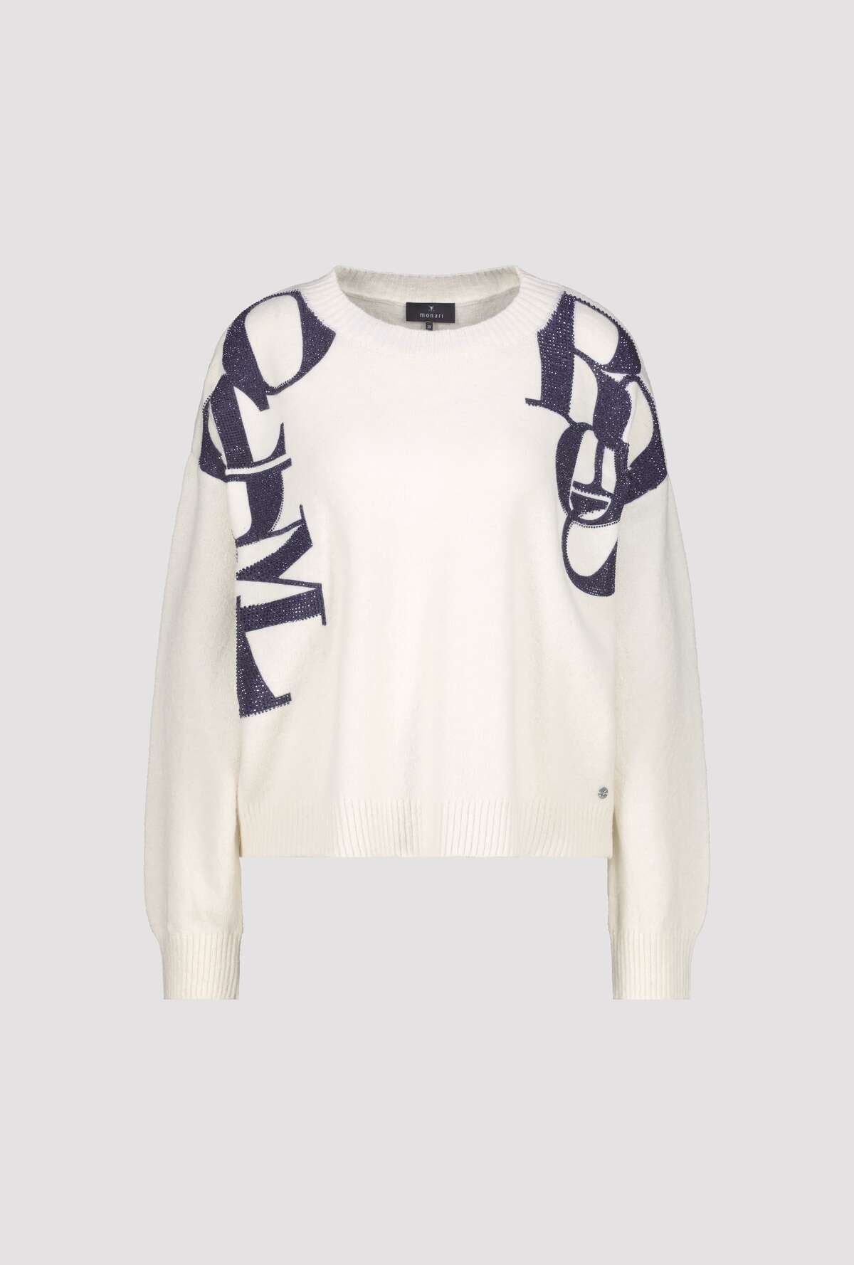 Elevate your wardrobe with this Monari jumper in ivory, crafted from a premium cotton blend for comfort and stretch. This sophisticated knit features soft-touch fabric enhanced by elegant blue printed lettering adorned with rhinestones. Designed with slightly dropped shoulders, a classic round neckline, and long sleeves, it offers both style and ease for refined, everyday wear with jeans.
