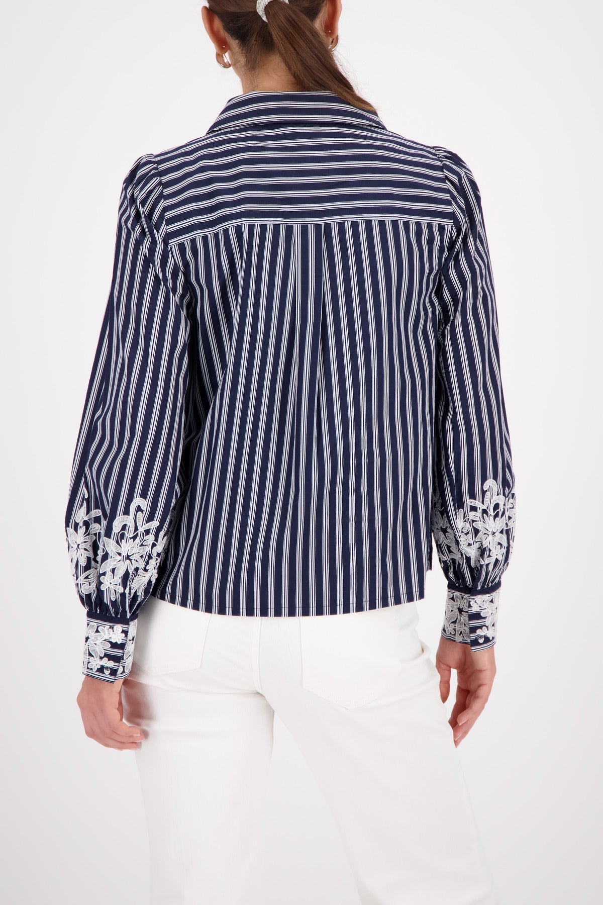 Elevate your everyday wardrobe with this sophisticated striped blouse, crafted from pure cotton for breathable comfort. The navy stripe pattern pairs beautifully with delicate lace detailing on the sleeves, while gathered puff sleeves and subtle pin tucks add contemporary charm. Versatile and refined, it's the perfect piece to dress up with tailored trousers or style down with your favourite skirt. A modern classic that celebrates timeless elegance.
