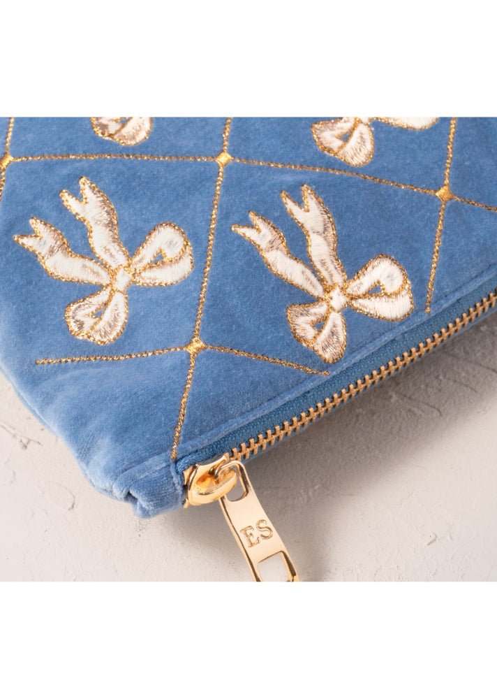 Elevate everyday moments with this exquisite Everyday Pouch, a thoughtful gift for the bride-to-be or someone truly special. Crafted from sumptuous dusky blue velvet, it features delicate embroidered bows adorned with shimmering gold-thread accents that catch the light beautifully. Perfectly proportioned to slip into your handbag or stand alone as a sophisticated clutch, this pouch transforms the ordinary into the extraordinary. Whether organising your daily essentials or presenting as a cherished gift, it brings a touch of timeless elegance and luxury to every occasion.