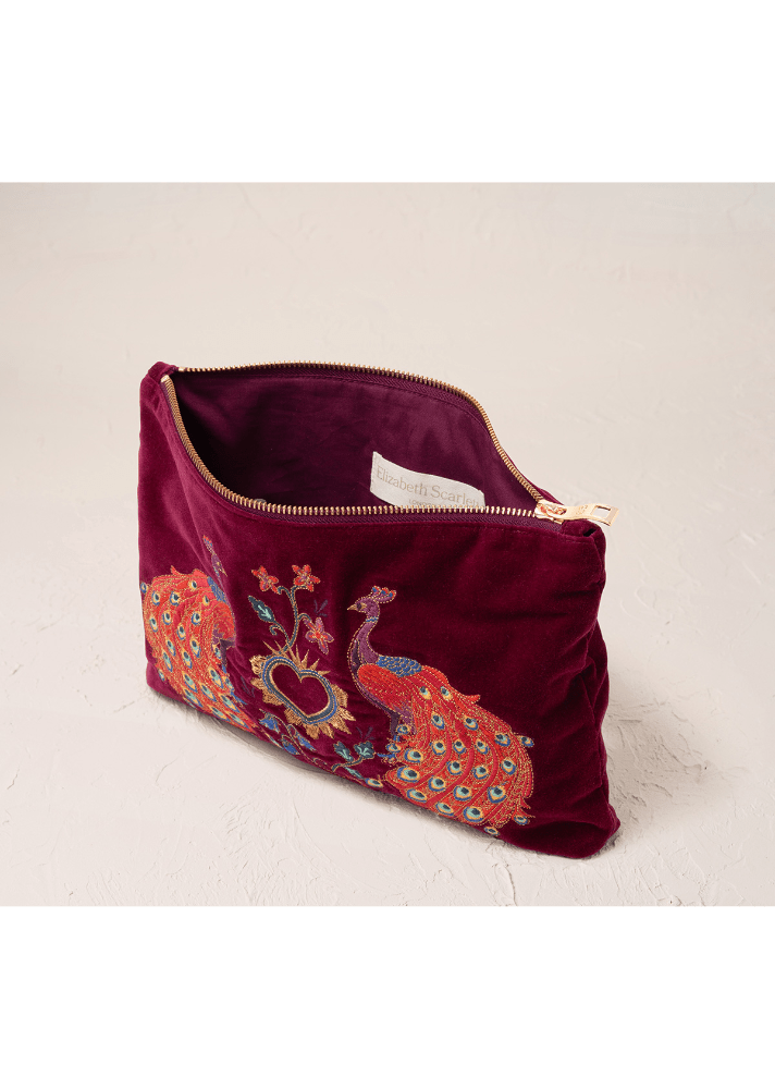 Complete with vivid peacocks embroidered in a secret garden, this Elizabeth Scarlett everyday pouch adds a touch of botanical romance to your daily routine. Expertly crafted with delicate embroidery on a soft and durable ruby velvet base, this elegant pouch offers both style and practicality. Perfectly sized to hold your essentials, it fits seamlessly into your handbag or can be carried as a chic clutch.