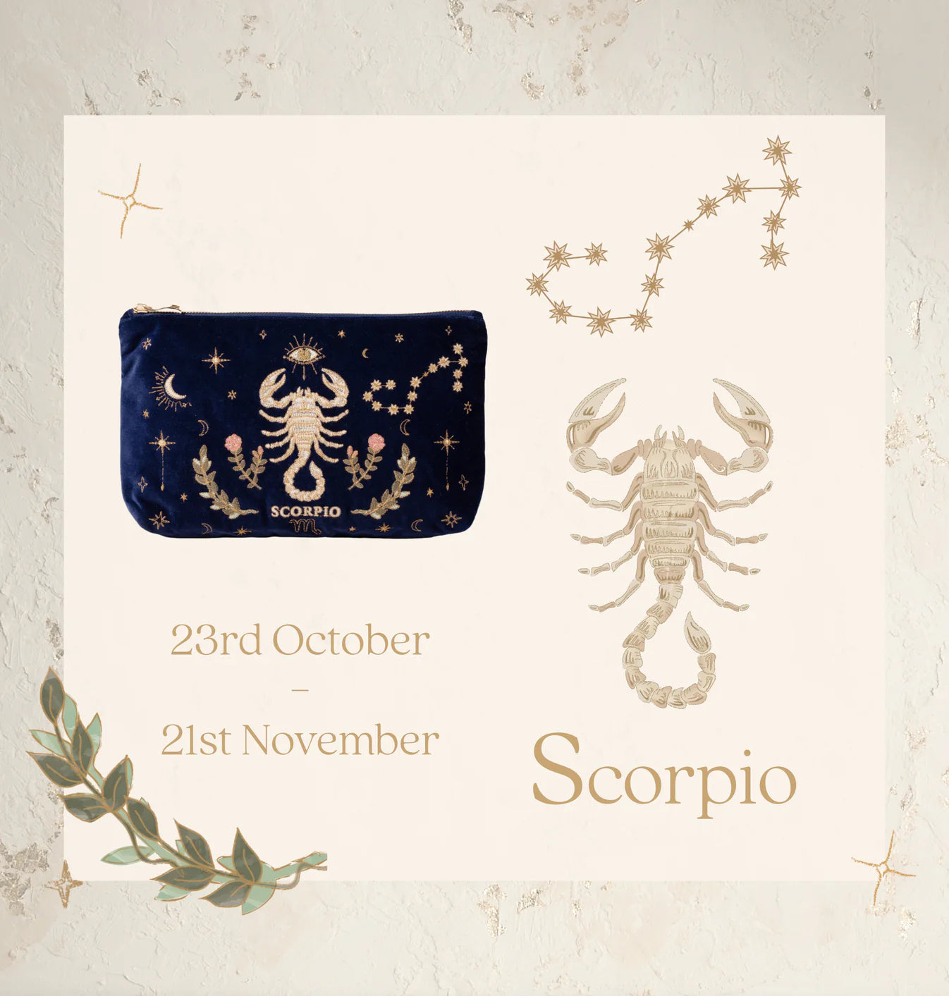 Celebrate your cosmic connections with this Elizabeth Scarlett everyday pouch in elegant navy blue velvet. Featuring delicate embroidery on both sides of the Scorpio zodiac sign, this pouch makes a luxurious and thoughtful gift. Crafted from a soft, durable fabric, it offers the perfect size for organising daily essentials, fitting effortlessly into your handbag or standing out as a chic clutch for days or evenings out. Lined with pure cotton, your belongings will be kept safe and sound.