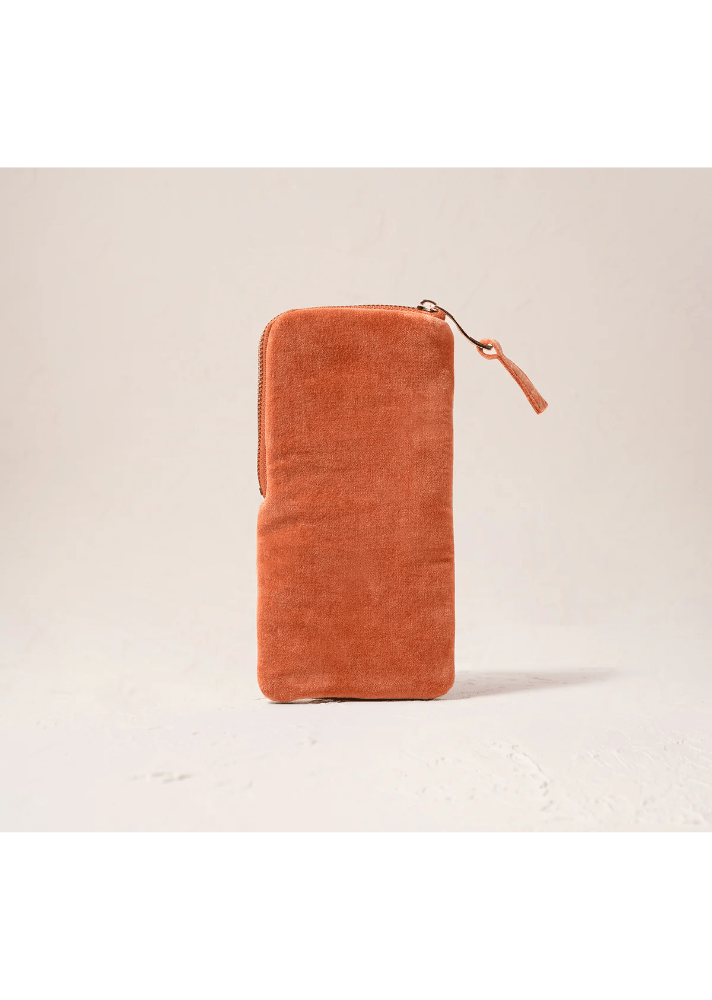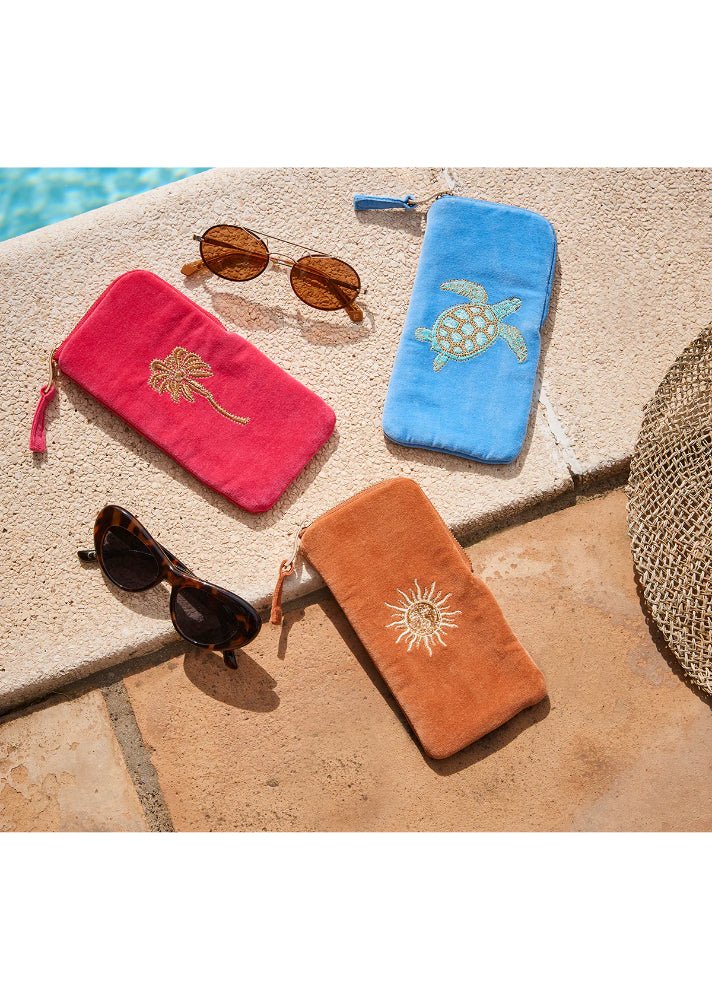 Elevate your accessory collection with this glasses case in rust orange. Crafted from plush velvet, this case features a hand-drawn sun motif with a human-like face, expertly embroidered in gold and vanilla threads. Beyond its striking design, it offers sturdy protection for your sunglasses, ensuring your lenses remain flawless wherever you go. A sophisticated travel essential that blends artistry with practicality.