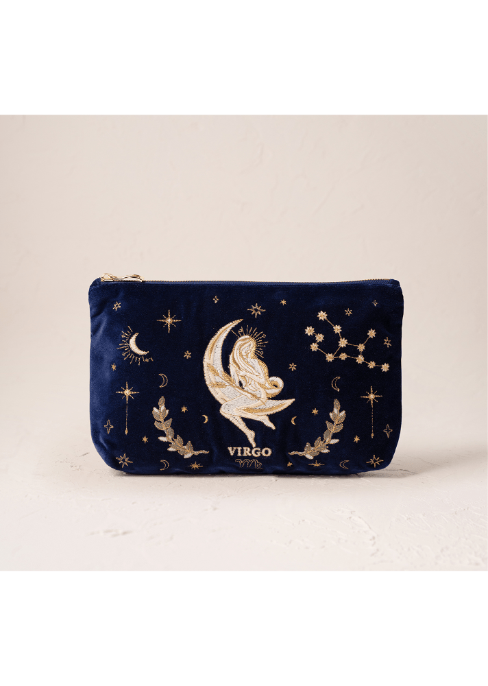 This Elizabeth Scarlett everyday pouch is crafted from luxurious navy blue velvet and features an intricately embroidered Virgo design. It is lined with soft, 100% cotton fabric to keep things safe and damage free. Organise your essentials with elegance or carry it as a sophisticated clutch. Combining practical functionality with cosmic charm, this bag makes a beautiful, personalised gift and a stylish addition to any accessory collection.
