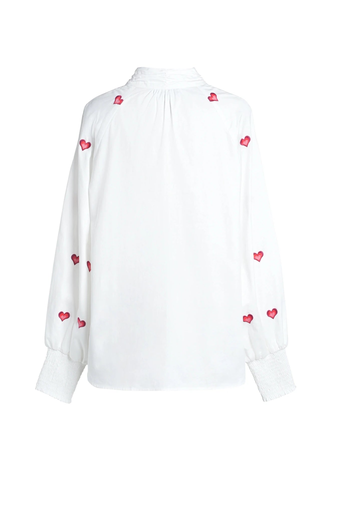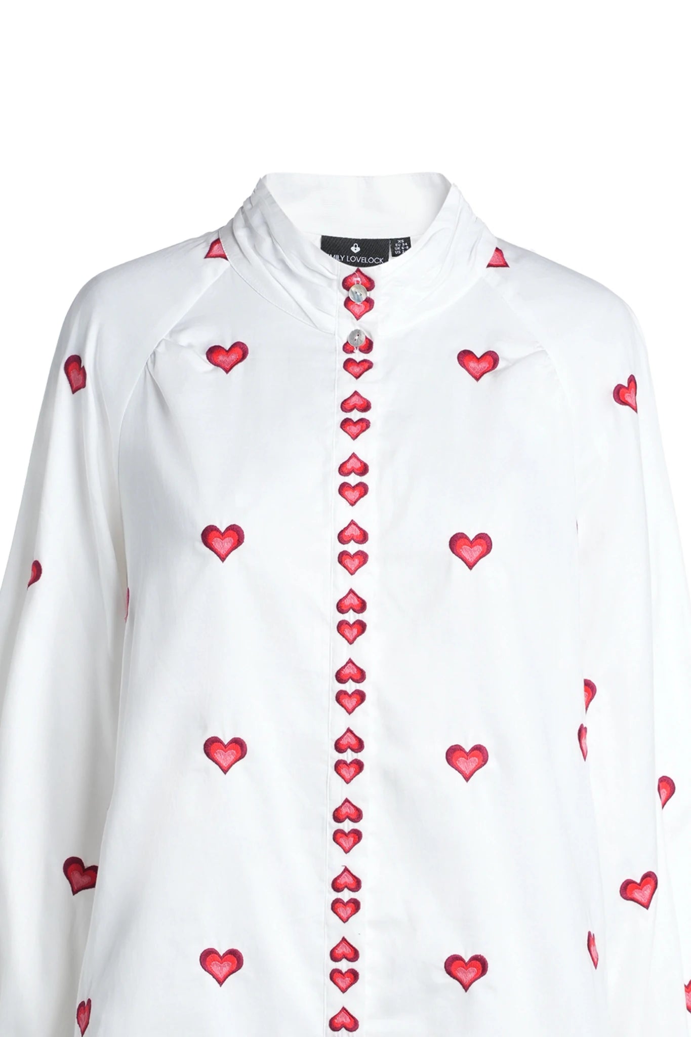 This Emily Lovelock Mona blouse is a crisp white cotton essential with a charming twist. A versatile piece featuring delicate red heart embroidery, a buttoned stand-up collar, and a concealed button placket. Wide elasticated cuffs adds comfort and style. This piece is effortlessly wearable across every season, whether you're dressing it up or keeping it casual. A blouse perfect for anyone with a big heart!