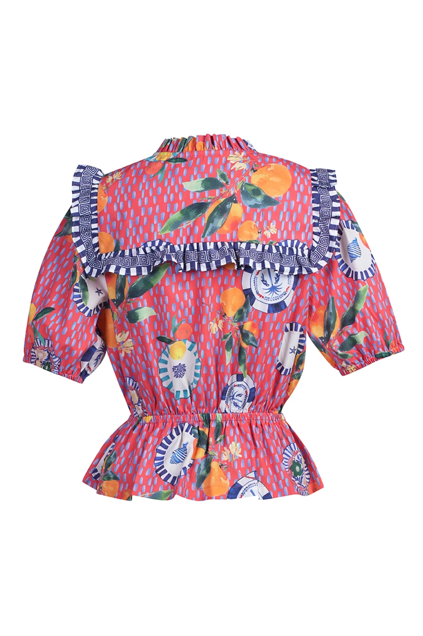 This beautifully patterned blouse features a romantic ruffle neckline and practical tie fastening that gives you complete control over your fit. The elasticated waist creates a defined, flattering shape you'll love, while contrast frill trim at the shoulders elevates the short sleeves with understated elegance. Whether you're dressing it up with the matching Bernie midi skirt or keeping things relaxed with your favourite jeans, this versatile piece delivers style and comfort whatever the occasion.