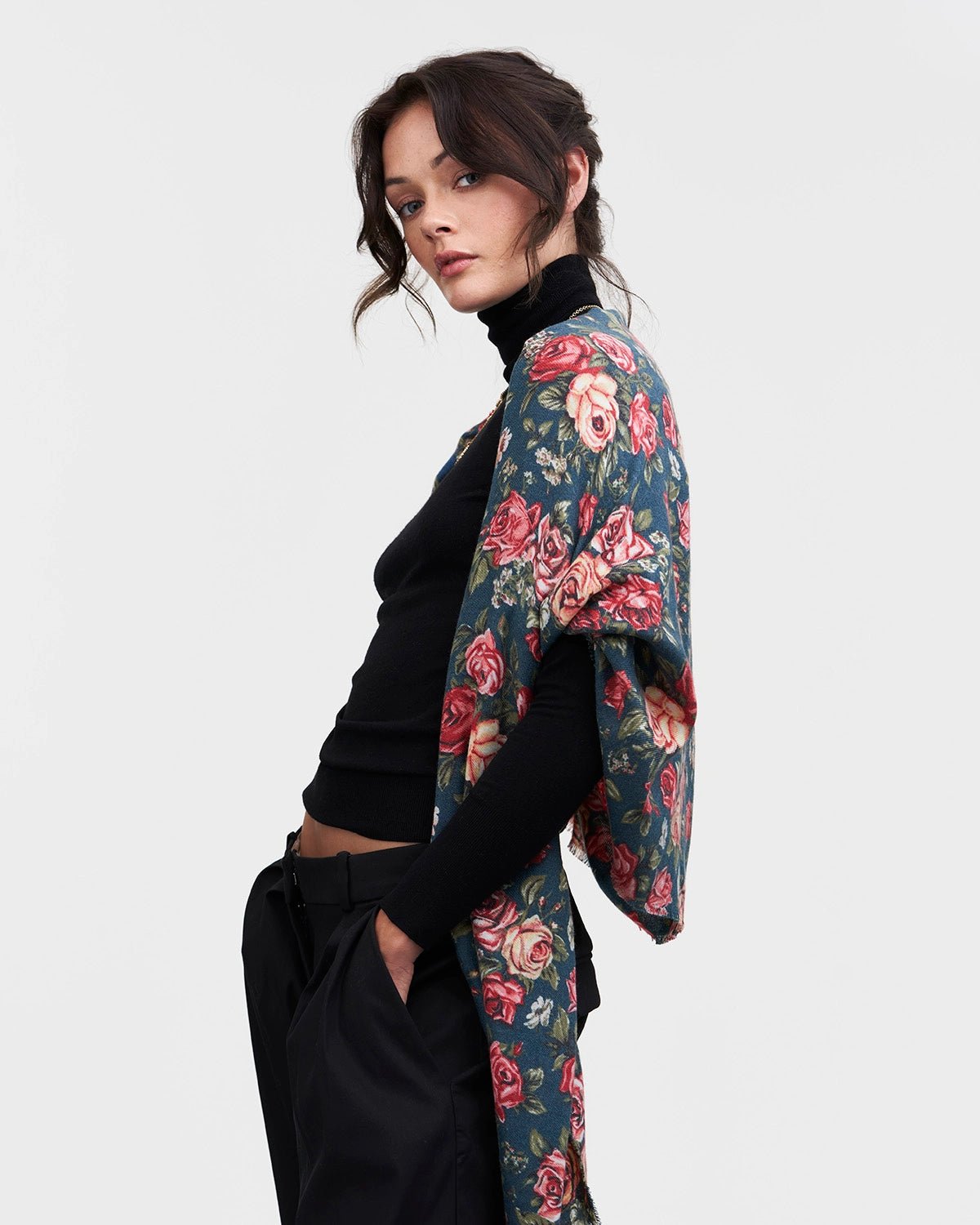 Step into your own floral fantasy with the Fable England "Roses" pashmina. Soft and lightweight, this scarf features a swirling rose print in red, blush, and gold on a deep teal background, inspired by beauty, strength, and stamina. Its generous size and delicate fabric make it perfect for adding a touch of elegance to any outfit while keeping you cosy. This timeless accessory supports your style effortlessly.