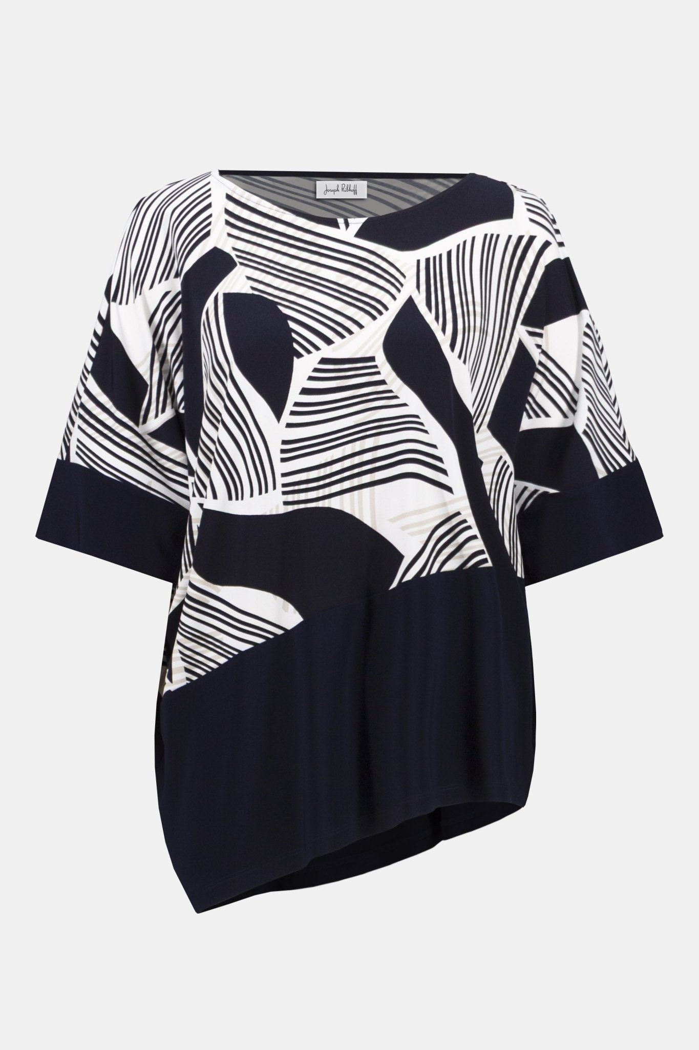 Effortlessly sophisticated, this Joseph Ribkoff silky knit top showcases a striking geometric print within a fluid cocoon silhouette. Dolman sleeves and an asymmetrical hem create dynamic movement, while the luxurious fabric drapes beautifully against the body. Pair with matching Joseph Ribkoff trousers for a polished, coordinated ensemble that exudes understated elegance.