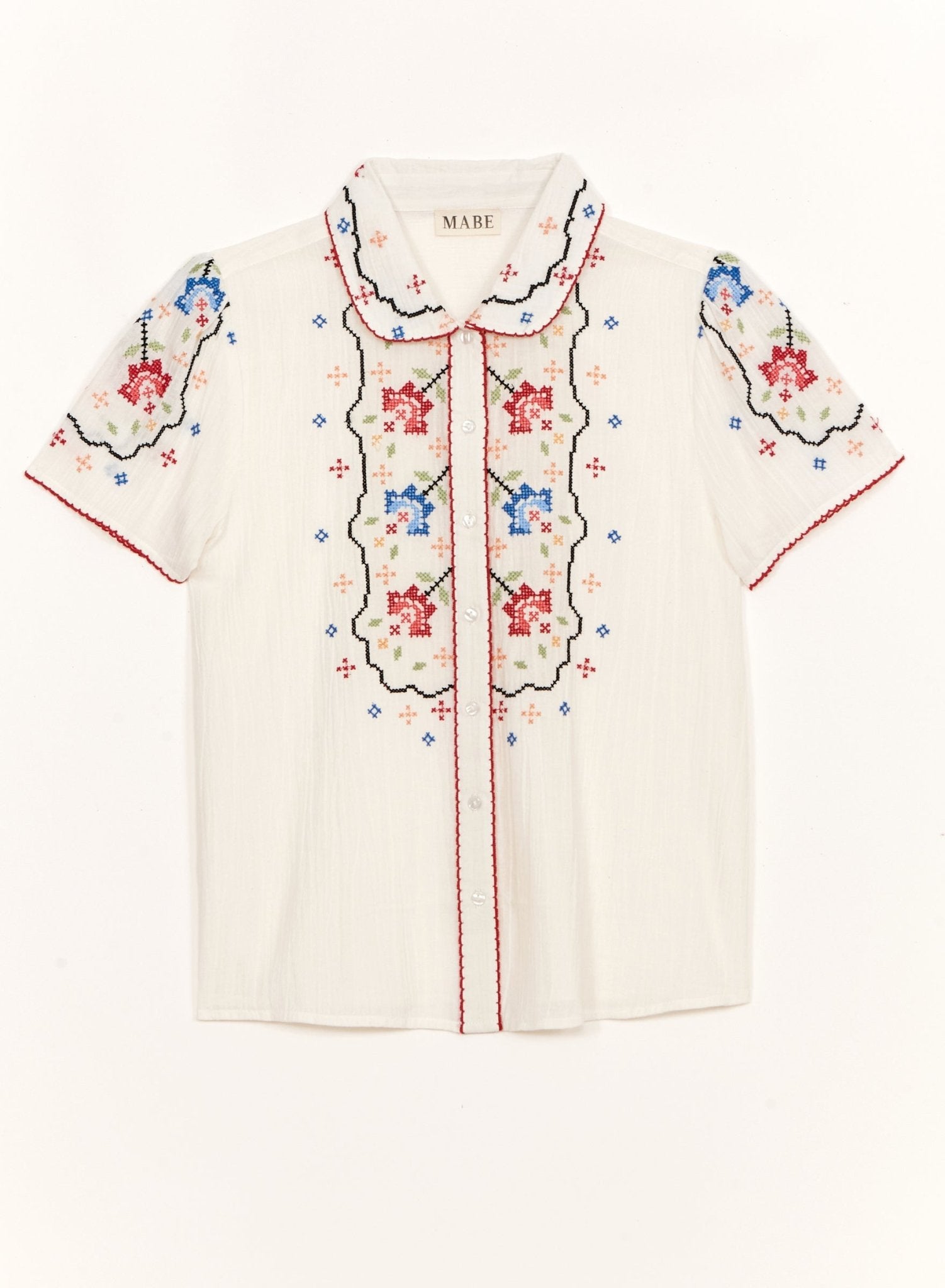 Elevate your everyday wardrobe with this charming M.A.B.E blouse, a timeless piece that effortlessly blends vintage-inspired details with modern comfort. The soft ecru cotton canvas features delicate cross-stitch embroidery in ruby and blue tones, creating a sophisticated focal point that works beautifully with everything from denim to tailored trousers. With its relaxed silhouette, Peter Pan collar, mother-of-pearl buttons, and delicate crochet lace trim, this blouse captures understated elegance and pairs seamlessly with your existing wardrobe.