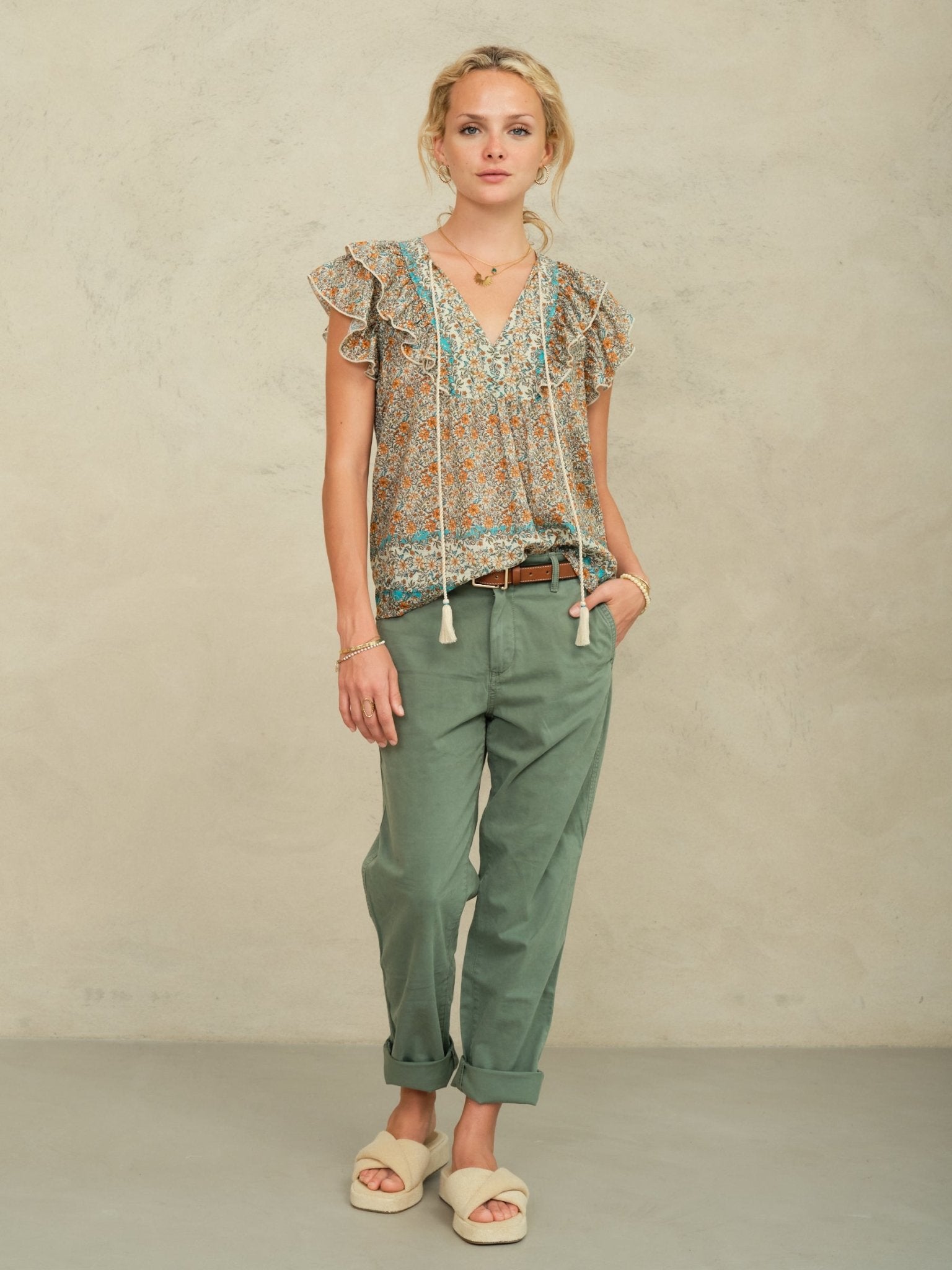 Elevate your warm-weather wardrobe with this charming Jaci print frill top. The lightweight cotton fabric keeps you cool and comfortable, while a vibrant ditsy floral pattern in blue, orange, and green adds instant personality to any outfit. Designed with a flattering V-neckline featuring delicate tassel ties, frilled shoulders, and cap sleeves, this piece effortlessly transitions from casual days to evening gatherings. Perfect paired with shorts, sandals and sunglasses for an effortless summer aesthetic.