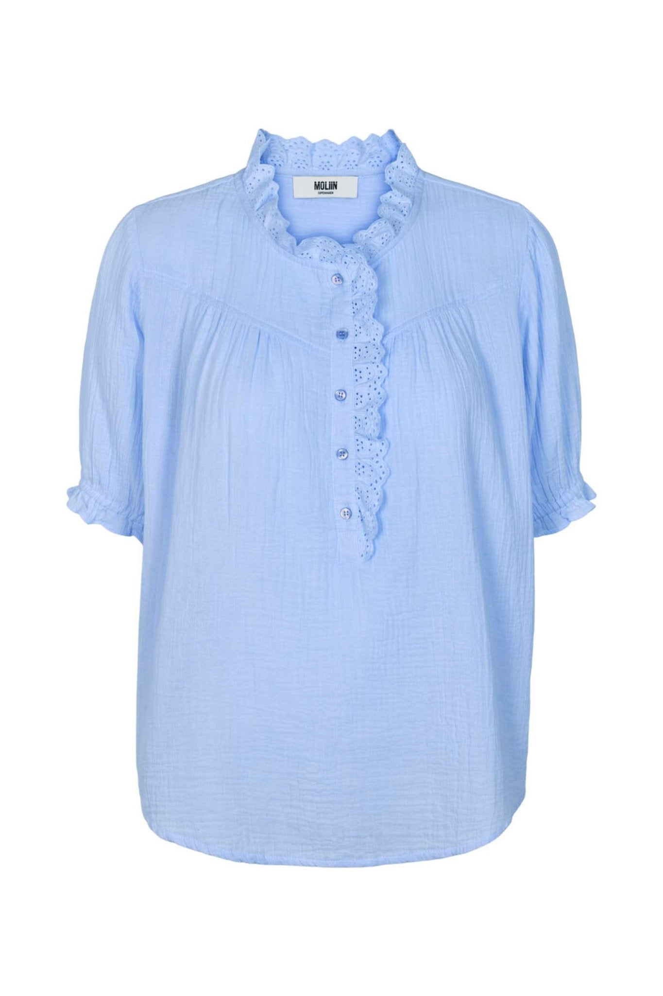 This beautifully crafted Bryanna top in soft waffle cotton features a graceful round neckline with delicate scalloped ruffles and a charming button placket adorned with decorative trim. The thoughtfully designed yoke gathers softly across the chest, creating a flattering shape that works with your natural silhouette. Short sleeves finished with elasticated cuffs and playful ruffle details add character and movement. In a light blue shade, this versatile blouse pairs effortlessly with your favourite separates.