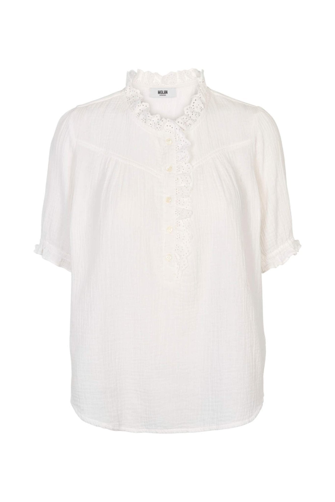 The Bryanna blouse brings effortless elegance to your everyday wardrobe. Crafted from soft waffle cotton, this feminine piece features a charming round neckline adorned with a delicate scalloped ruffle, paired with a short button placket trimmed in decorative ruffles. The gently shaped yoke creates soft gathers across the chest for a flattering silhouette, while short sleeves with elasticated cuffs and subtle ruffle detailing add playful texture. In pure white, it's the perfect companion to casual separates, offering versatile styling throughout the day.