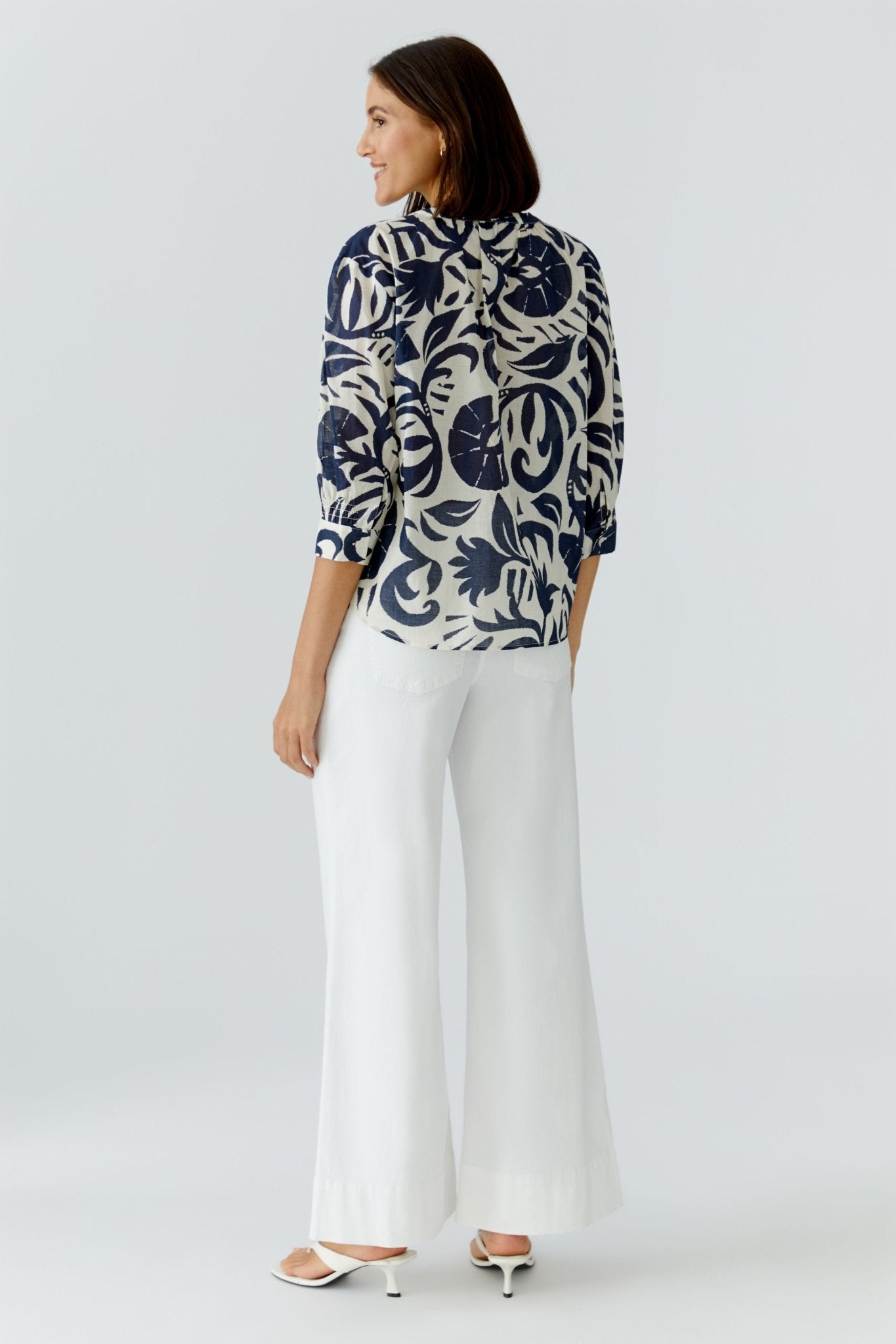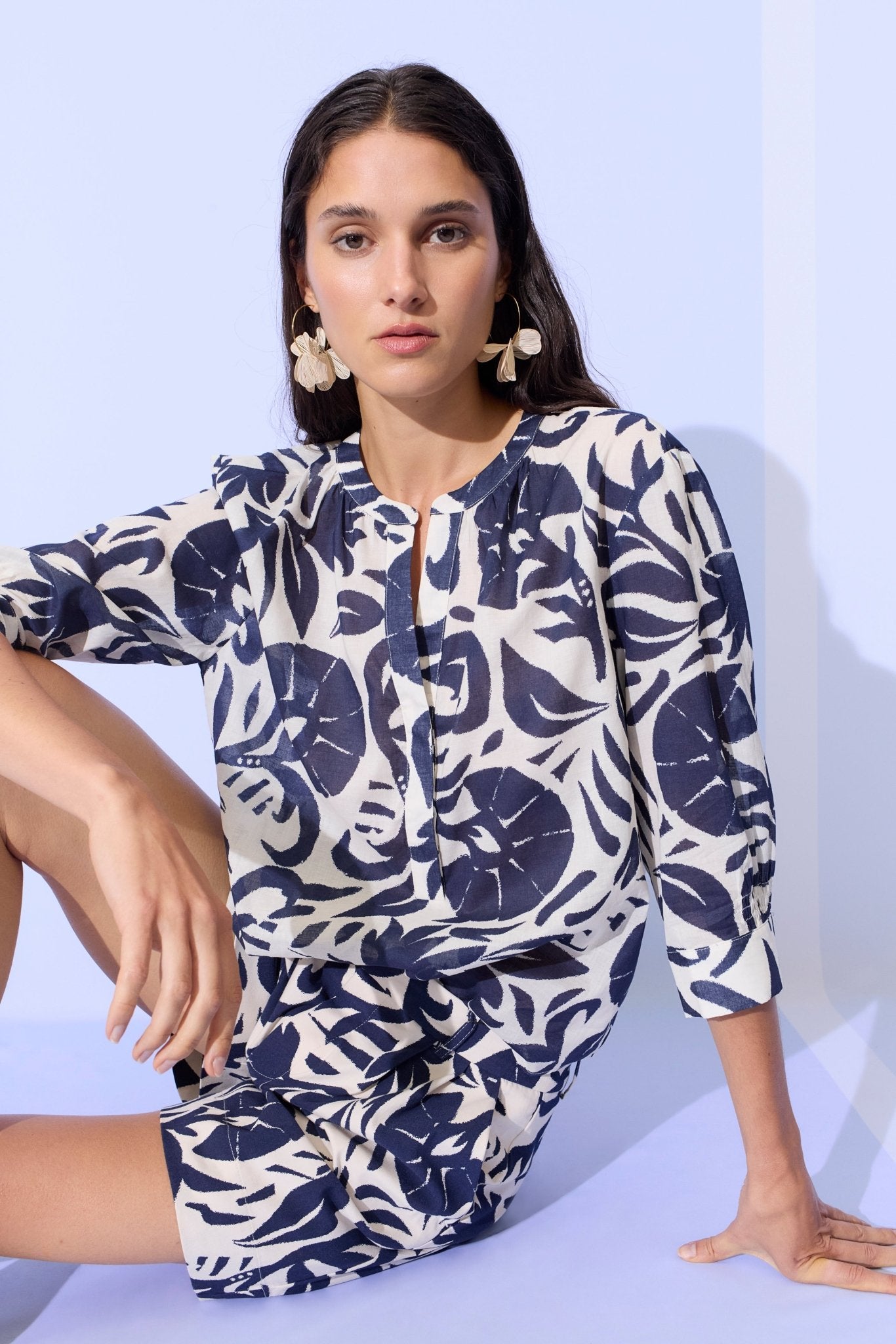 Effortlessly versatile, this pure cotton tunic blouse brings contemporary style to your everyday wardrobe. The striking blue and white floral print pairs beautifully with its thoughtfully designed features—a round neck with subtle slit, gathered detailing, and flattering 3/4 sleeves. The curved hemline and casual fit make it equally at home layered over tailored trousers for the office or styled with cropped linens for weekend ease. Soft, breathable cotton ensures all-day comfort, while the timeless design transcends seasons.