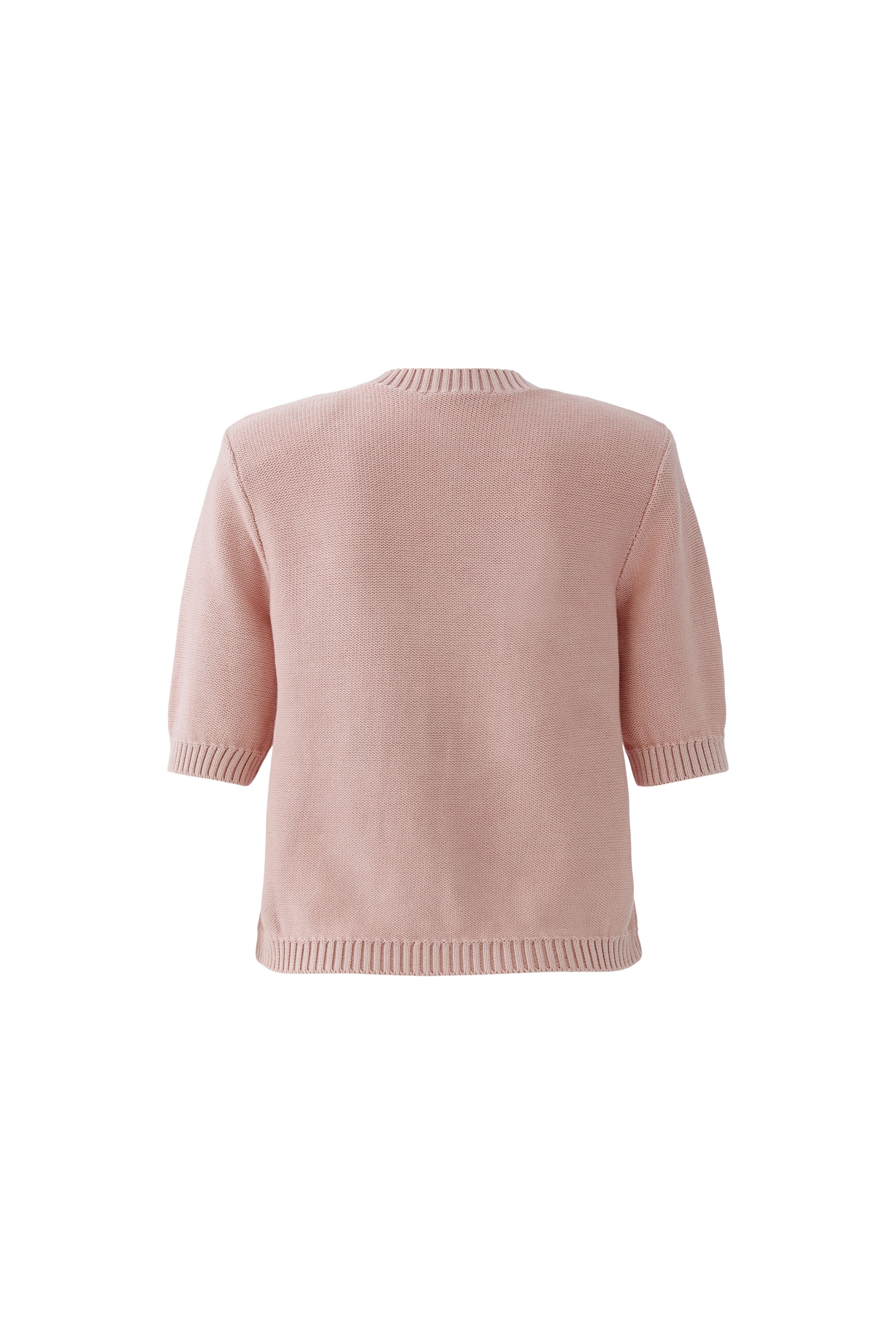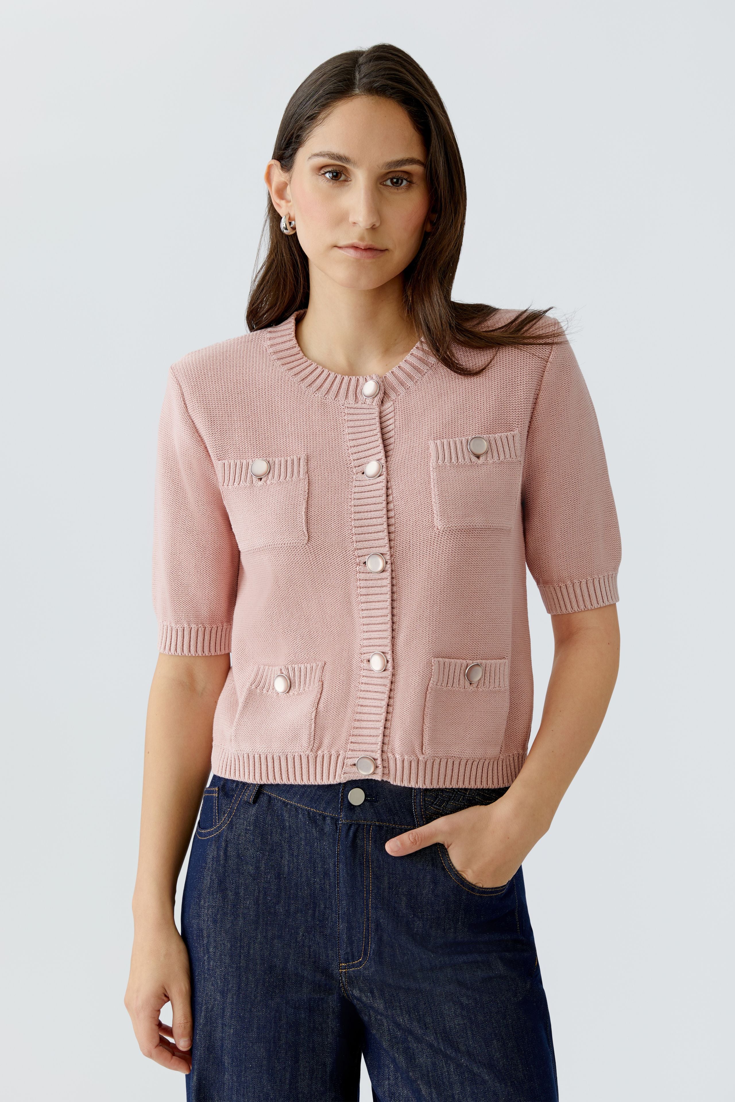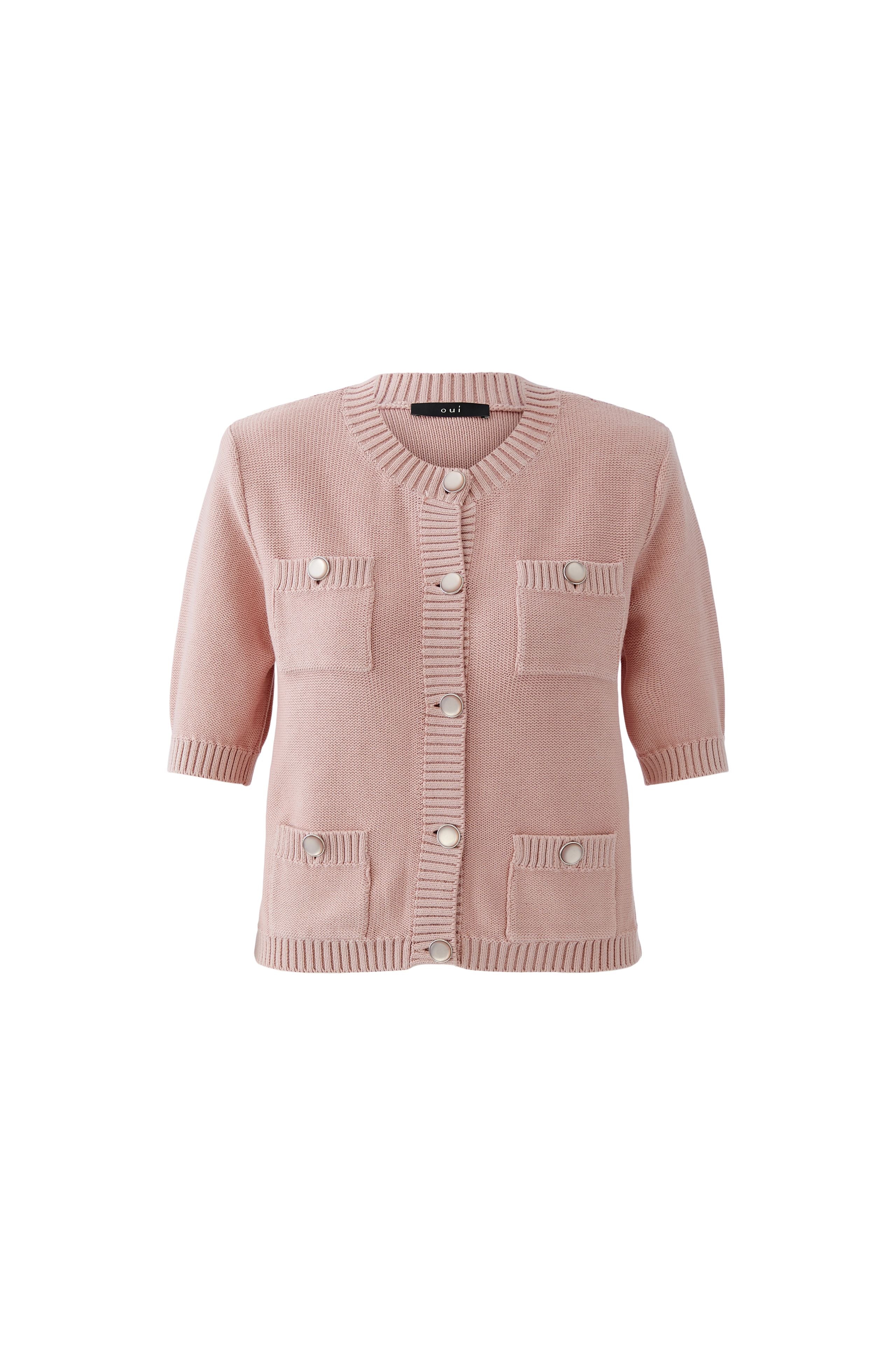Elevate your everyday style with this charming blush pink cardigan from Oui. Featuring a flattering short length with half-length sleeves, it's designed for versatility—wear it buttoned up as a standalone piece or layer it open over your favourite t-shirt or vest. The round neckline and four front pockets add design detail, while statement buttons bring a decorative touch that catches the eye. Perfect for transitional seasons, this piece works beautifully whether you're dressing up or keeping it casual.