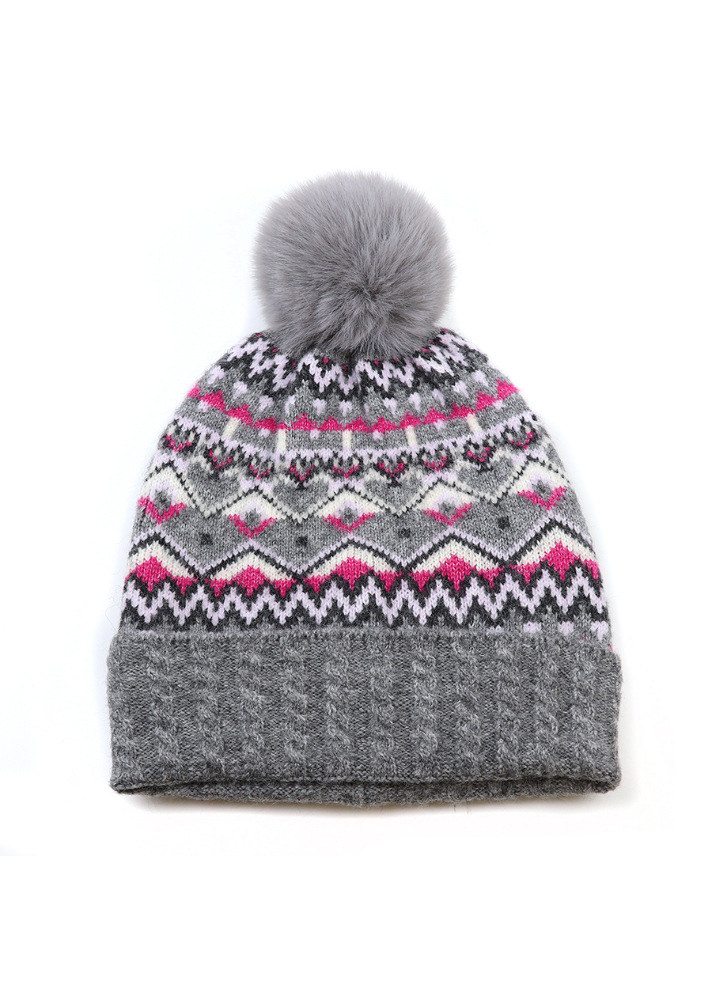 Stay cosy this season with this POM bobble hat in soft grey recycled blend yarn. Featuring a charming pink and white Fair Isle knit pattern topped with a luxurious faux fur pom-pom, this hat brings warmth and style together. Complete your look with the matching pull-through scarf and fingerless gloves, all designed in the same eye-catching pattern. Perfect for layering through autumn and winter while supporting sustainable fashion choices.