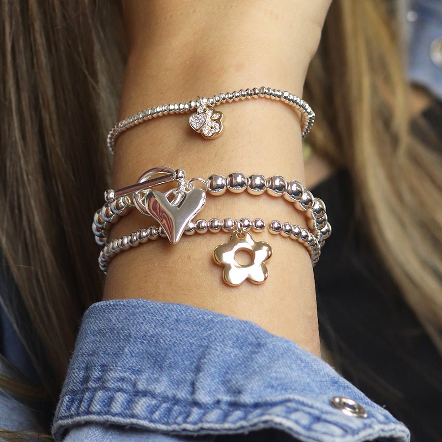 Elevate your everyday style with this charming stretch bracelet, featuring lustrous silver plated beads that catch the light beautifully. It has a polished heart charm and secures with a stylish t-bar clasp to ensure your bracelet stays put throughout the day. Perfect for layering or wearing solo, this versatile piece complements any outfit and makes a thoughtful gift for someone special.