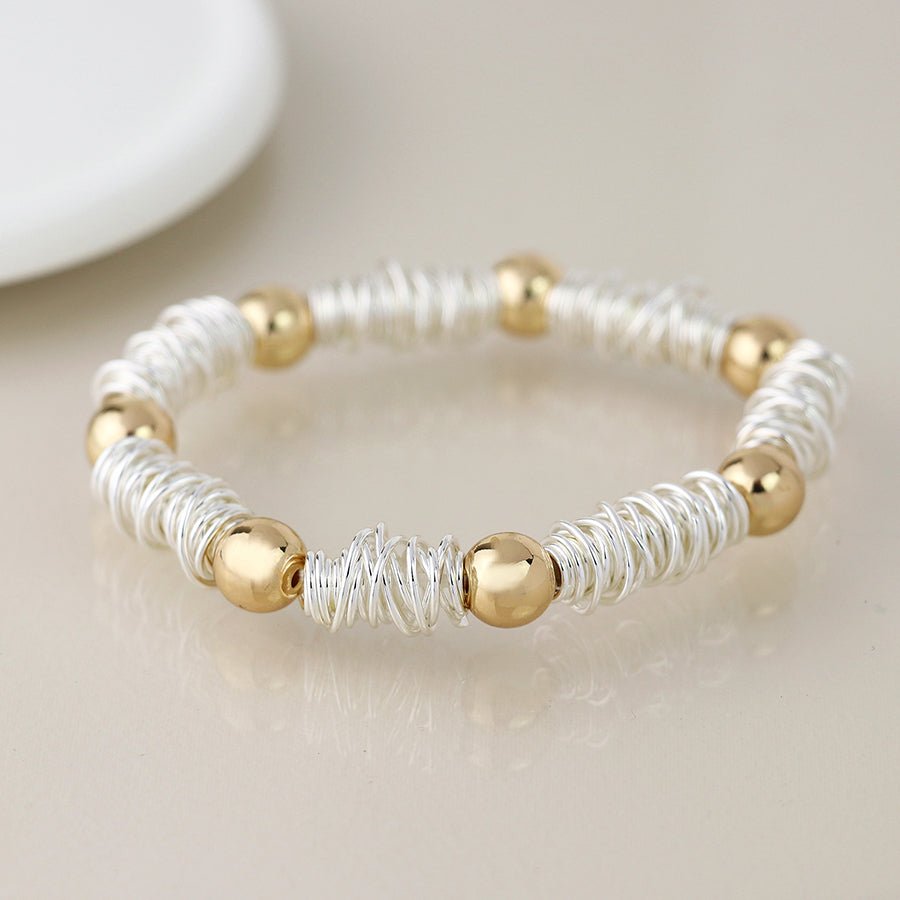 This elegant stretch bracelet combines the best of both worlds with its striking silver plated base and luxurious faux gold plated polished beads. The unique spun yarn effect sections add wonderful texture and visual interest, creating a piece that's both modern and timeless. Perfect for layering or wearing solo, this versatile bracelet transitions effortlessly from day to evening. The comfortable stretch design means it slips on easily, an accessible choice for anyone seeking a touch of understated glamour in their jewellery collection.