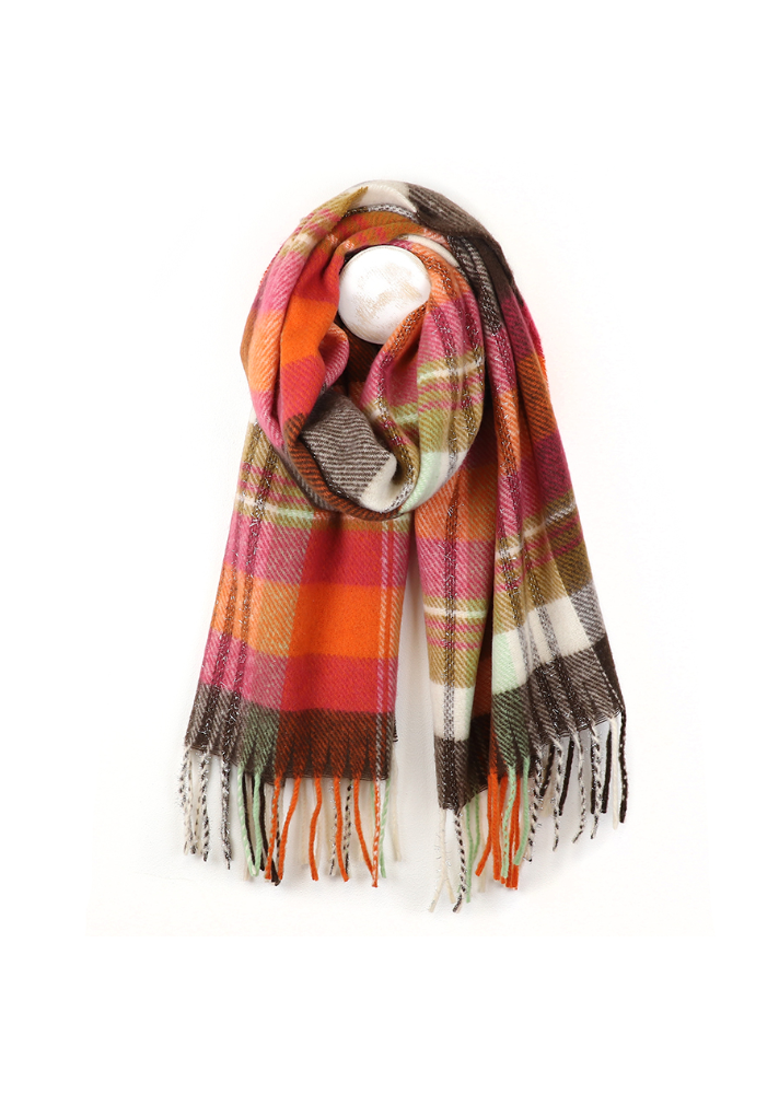 Elevate your everyday style with this vibrant tartan check scarf, featuring a striking blend of magenta, orange, cream, and ochre tones. Woven with shimmering lurex thread for added glamour, it's finished with tassels at each end. This versatile piece brings instant colour and pattern to any outfit. Perfect for those moments when you want to inject personality into your look without overthinking it.