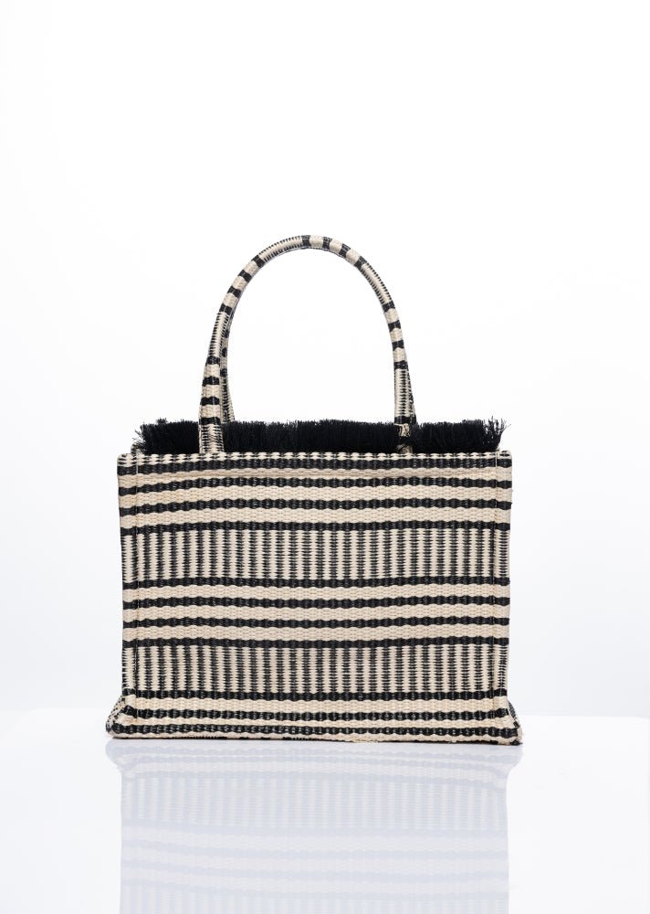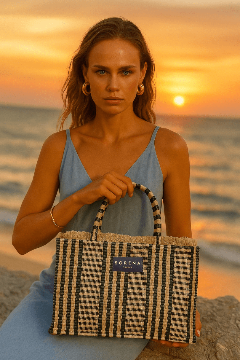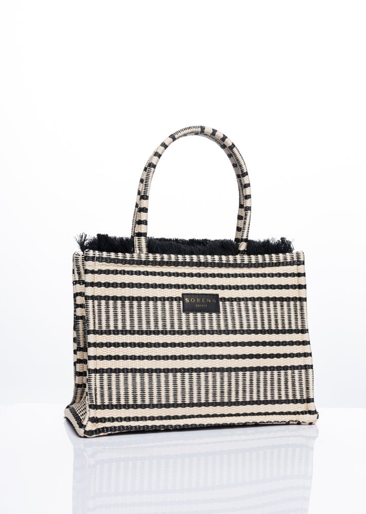 Discover timeless elegance with this stunning medium tote from Sorena, a celebrated Greek designer. Featuring a sophisticated beige and black striped pattern, this versatile bag combines style with practicality. The signature red lining adds a luxurious pop of colour, while the secure zip top closure keeps your essentials safe. An interior zipped pocket provides organised storage, and the detachable shoulder strap offers flexible carrying options. Perfect for everyday adventures or weekend getaways, this beautifully structured tote is a wardrobe essential that effortlessly transitions from day to night.