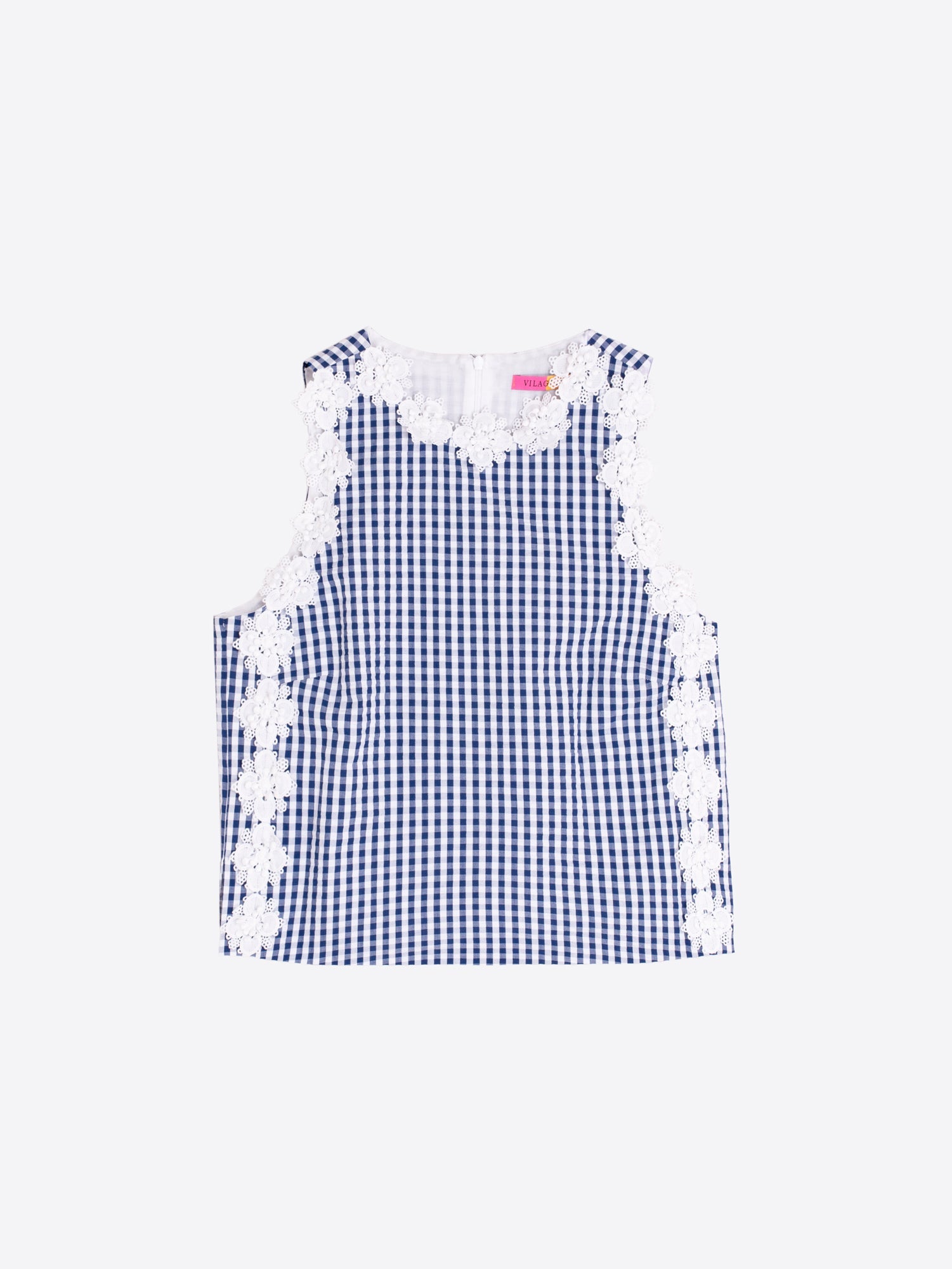 Dress for the sunshine with this charming Vilagallo seersucker top, featuring a crisp gingham check pattern in navy and white. The sleeveless design showcases a high round neckline adorned with delicate flower embroidery trim, while the back neck zip adds practical elegance. Crafted from 100% cotton seersucker fabric, it's breathable and perfect for warm weather styling. Pair it with the matching Vilagallo trousers to create a coordinated set that's effortlessly chic.