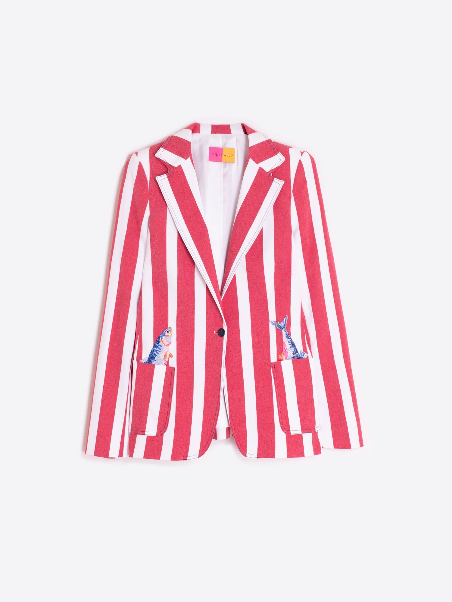 This striking Vilagallo Gadea jacket gives timeless style and playful details. The bold red and white vertical stripes create instant visual impact, while charming fish embroidery on the patch pockets adds personality and conversation-starting flair. Crafted from a breathable blend of polyester, viscose, and elastane, this lightweight jacket layers beautifully over t-shirts, blouses, and knitwear. The notched collar and single button closure deliver classic tailoring, while the lined interior ensures comfort and longevity. Perfect for styling through seasons, this versatile piece transitions effortlessly from casual to smart-casual occasions.