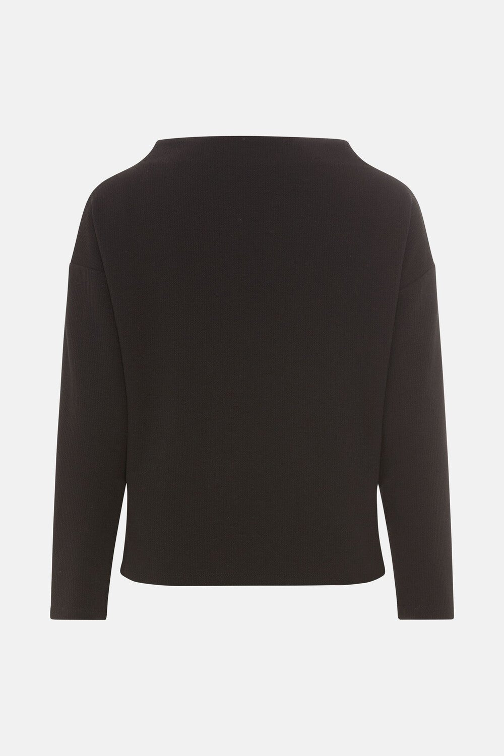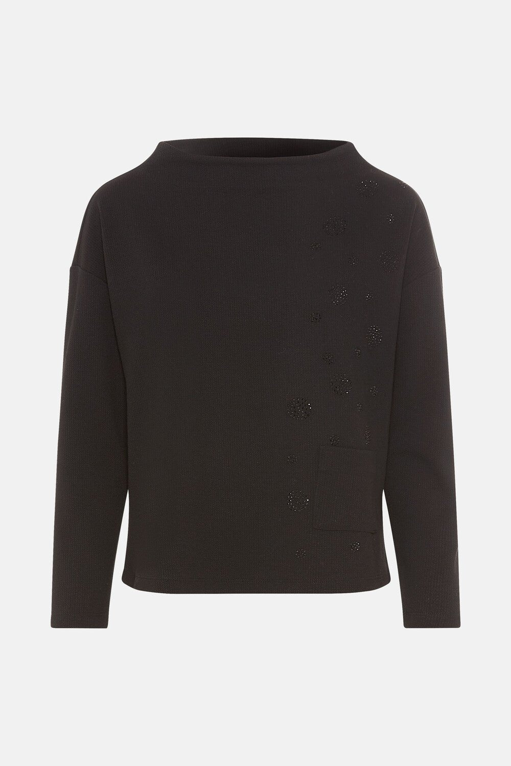 This black sweatshirt offers a modern casual look with thoughtful features for comfort and style. Its elegant funnel neck and contemporary dropped shoulders create a relaxed silhouette, while the straight cut enhances ease of wear. The rhinestone spot design along one side adds just the right amount of sparkle to brighten your everyday outfits. Made with stretch content fabric and finished with a patch pocket, it’s designed to keep you feeling comfortable and confident throughout the day.