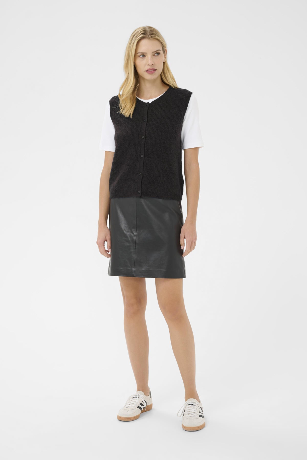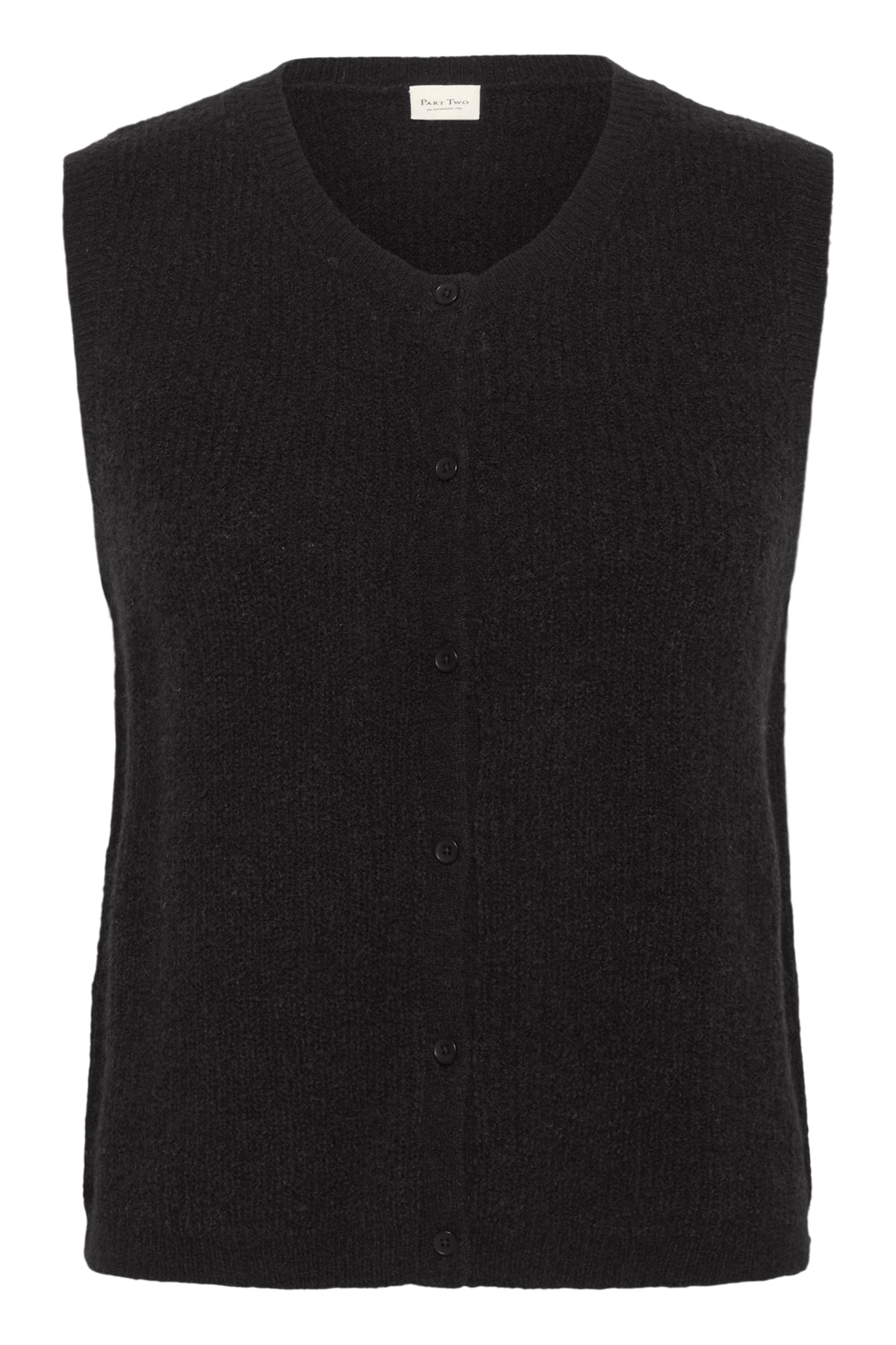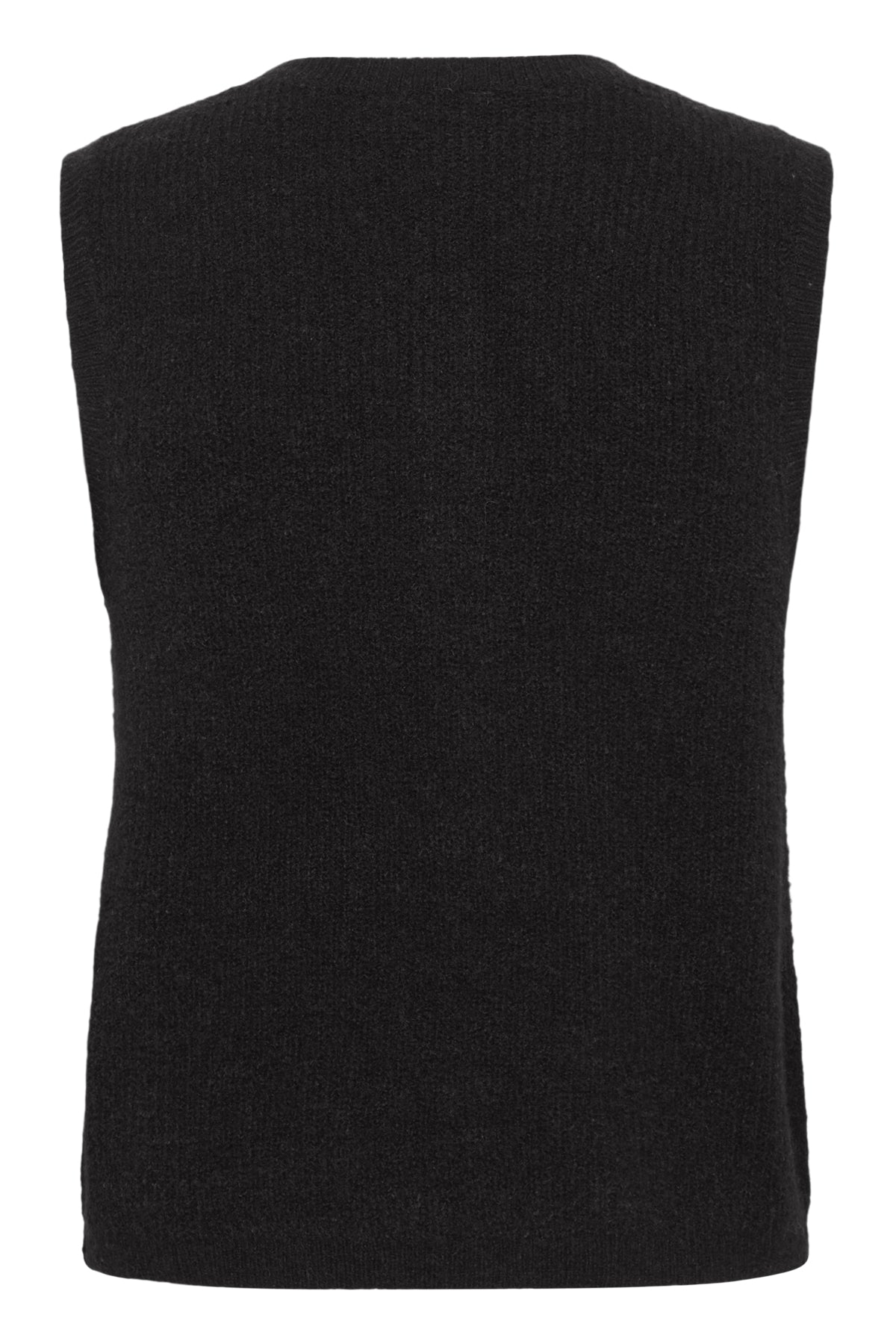 This classic black knitted waistcoat from Part Two features a simple, timeless design with a round neck and button closure at the front. Crafted from a soft wool blend yarn, it offers comfortable layering over tees and blouses or can be worn directly against the skin for added warmth and style. Its versatile silhouette makes it a refined addition to any wardrobe.