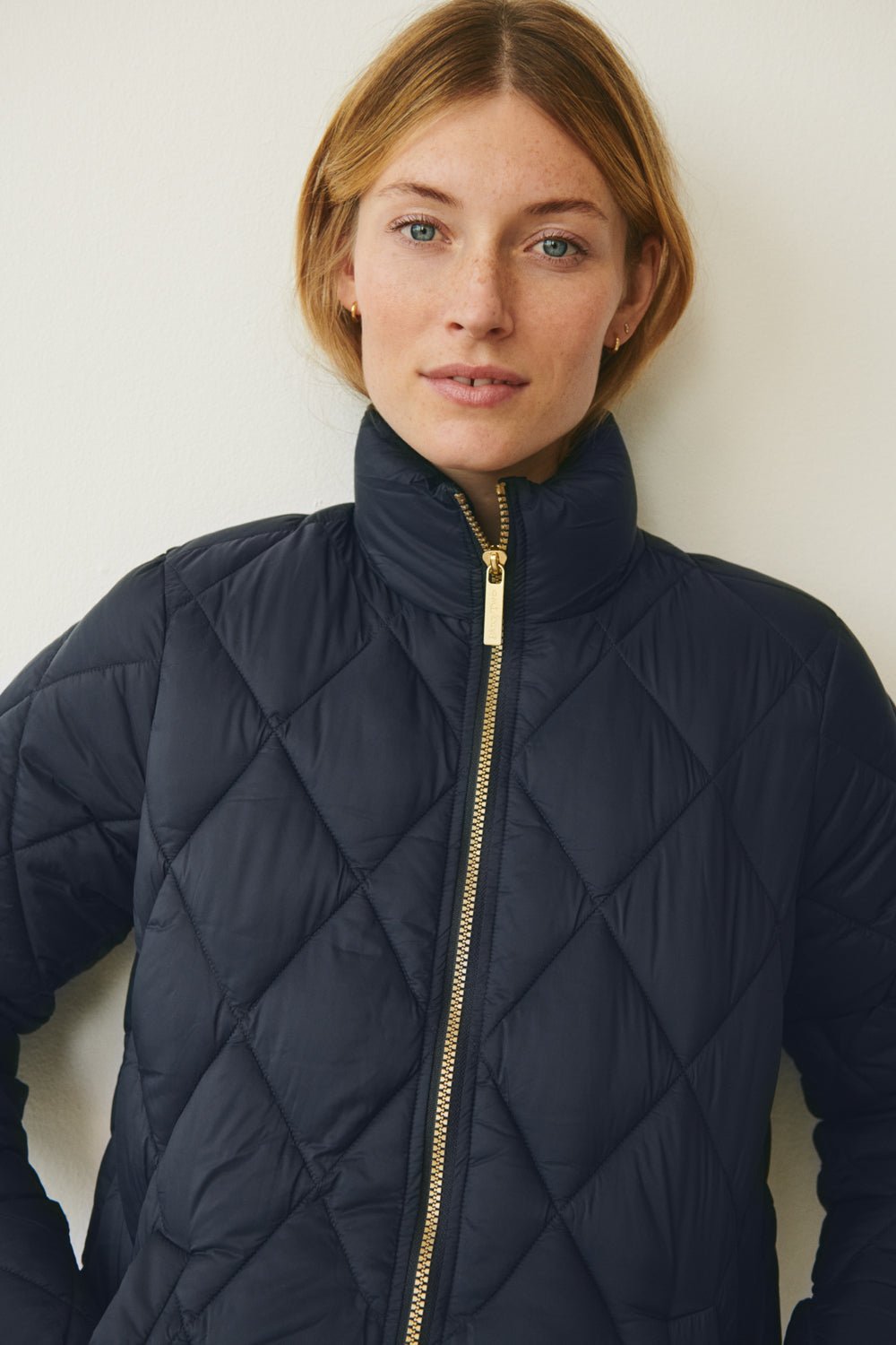 The Part Two Olilas coat comes in a relaxed fit with quilted fabric offering a fashionable look. A funnel neckline and front pockets are enhanced with a gold zip for a chic twist. This mid-length navy blue coat will keep you cosy and fashionable no matter the occasion.