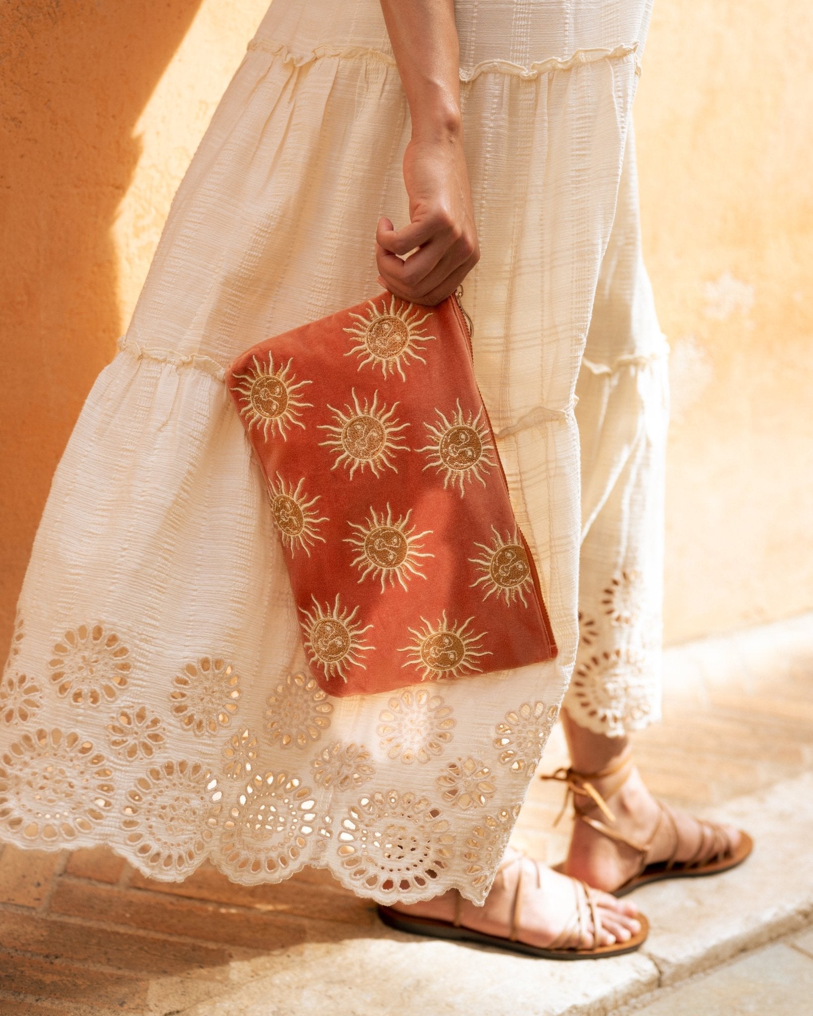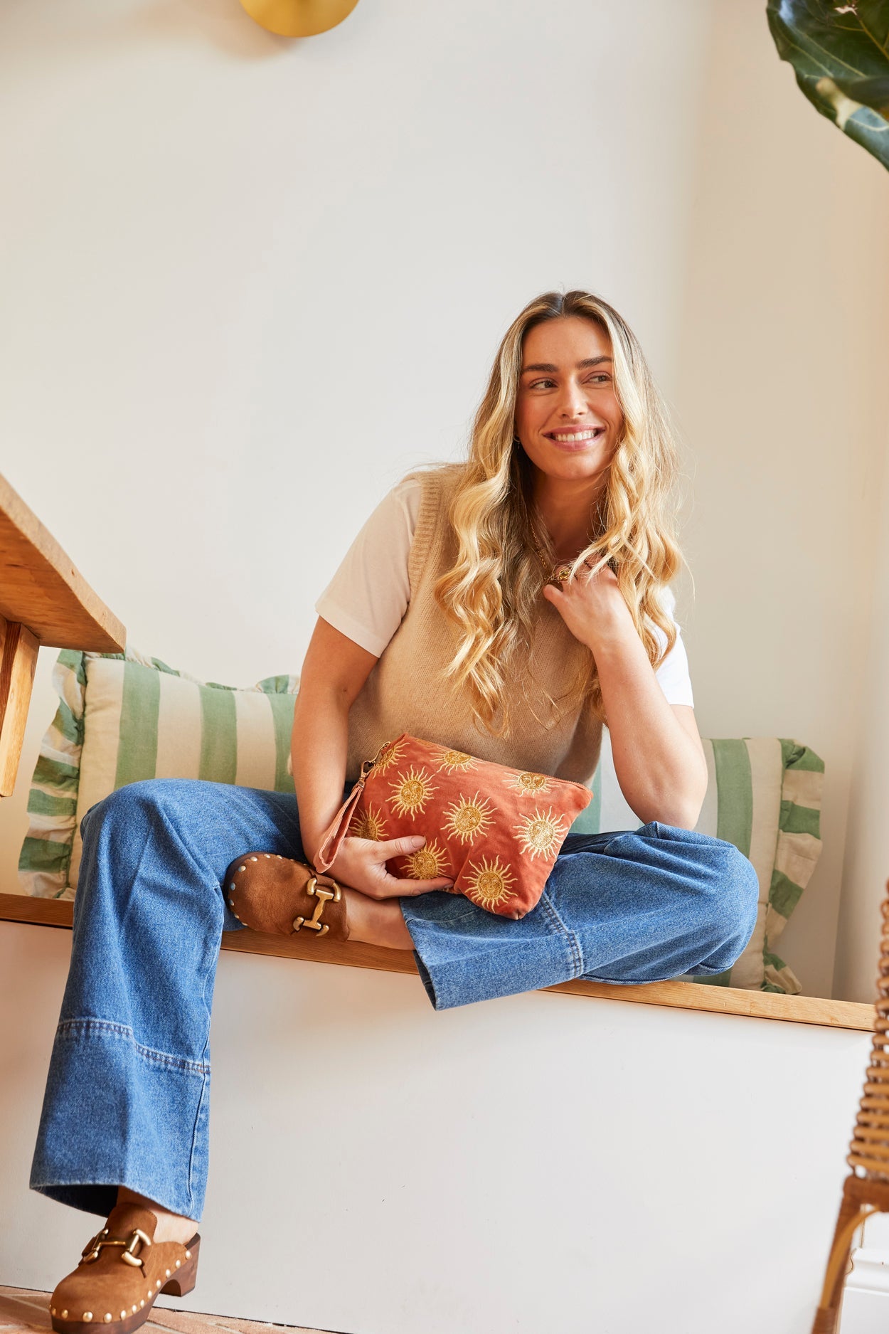 Introducing the Elizabeth Scarlett Sun Goddess Everyday Pouch in Rust Orange. Luxuriously embroidered in gold and vanilla, this versatile pouch is perfect for keeping your daily essentials stored. Its soft velvet base features a hand drawn sun motif, symbolising warmth and vitality. Make life more organised and luxurious with this timeless pouch.
