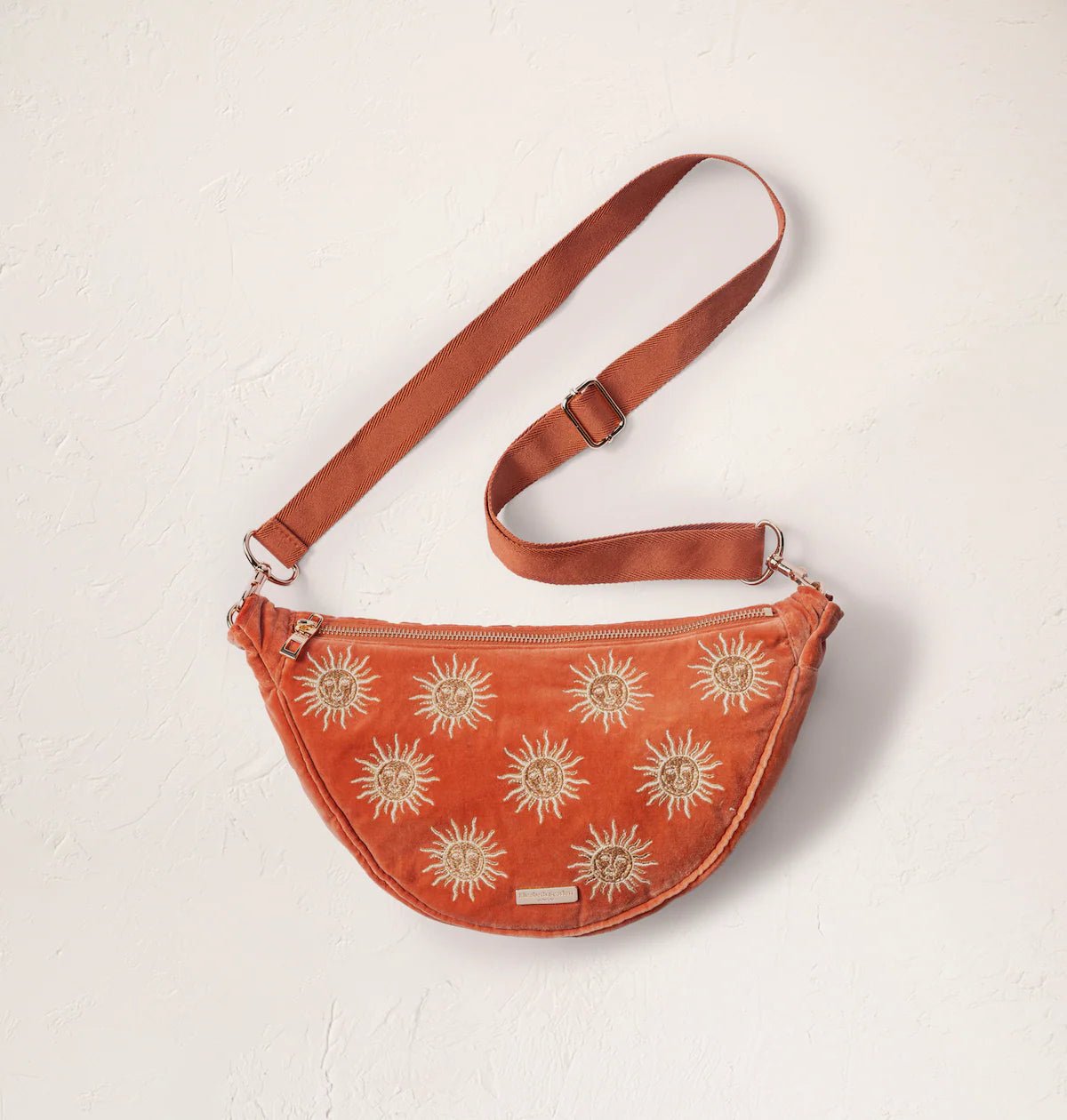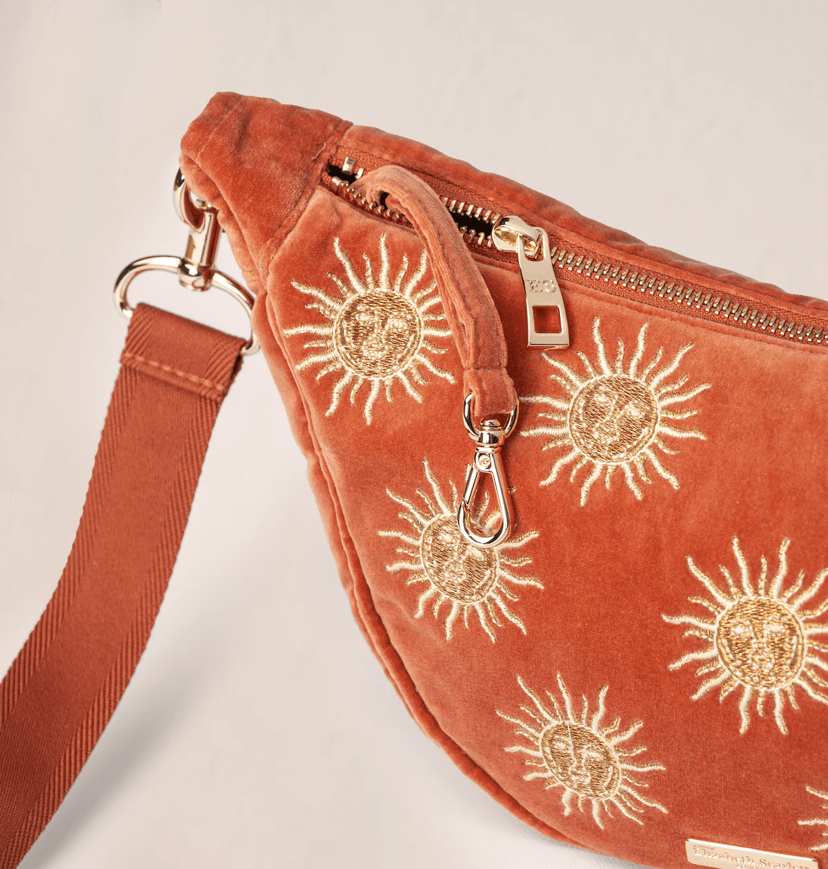 Discover the Elizabeth Scarlett sun goddess crossbody sling bag in rust coloured velvet fabric—a beautiful fusion of artistic design and everyday practicality. This striking accessory features a hand-drawn sun character design with intricate gold and vanilla embroidery, bringing warmth and personality to your daily routine. Perfect for those who appreciate thoughtful craftsmanship and sustainable fashion, it includes an adjustable strap, key clip, internal zip pockets and zipped closure.