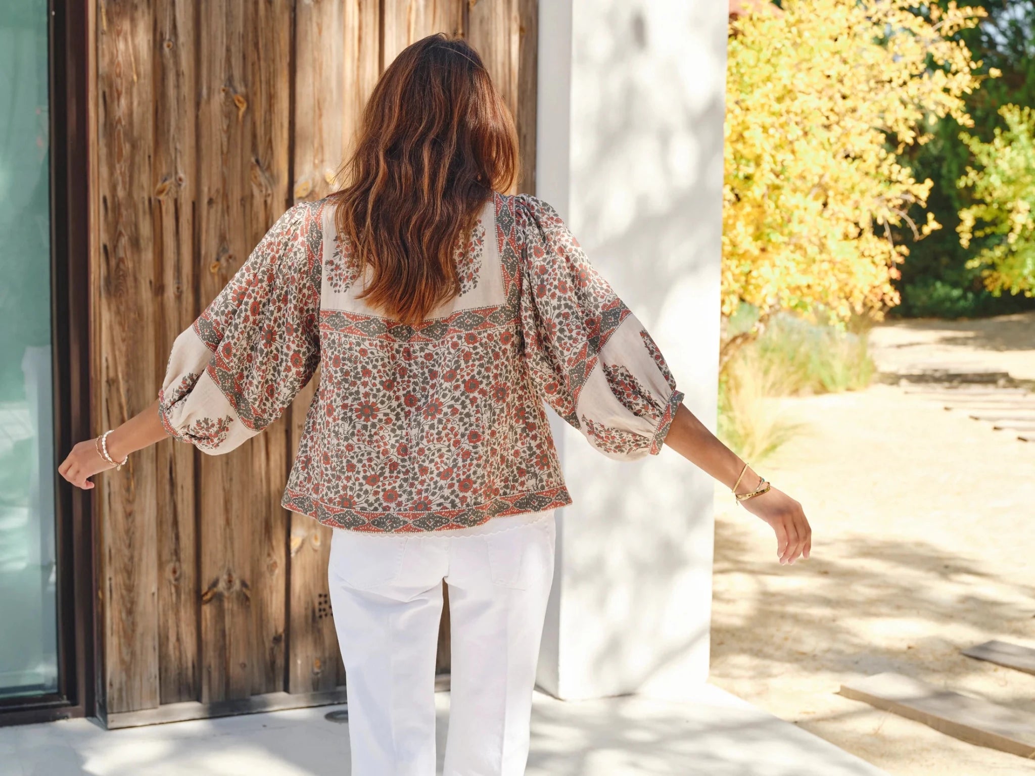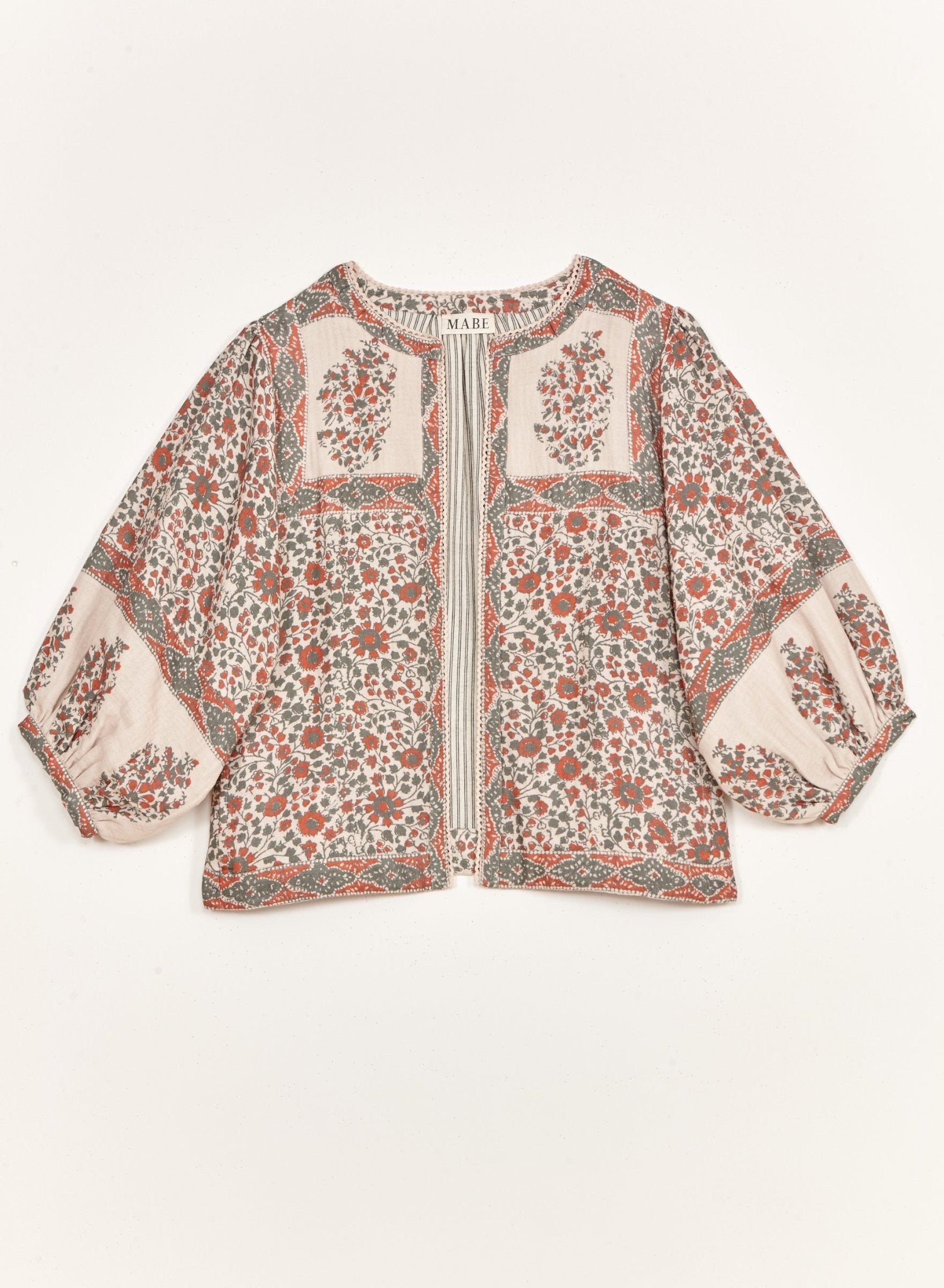 Elevate your spring-summer style with the M.A.B.E Della jacket—a versatile statement piece perfect for casual summer occasions. This cropped, boxy silhouette features a bohemian rust and khaki floral print with delicate lace trim, rounded neckline, and three-quarter gathered sleeves for a relaxed yet feminine look. Crafted from 100% cotton with a striped woven lining, side slip pockets, and wide arm openings for comfort, it's designed to work beautifully with everything from simple tees to sundresses.
