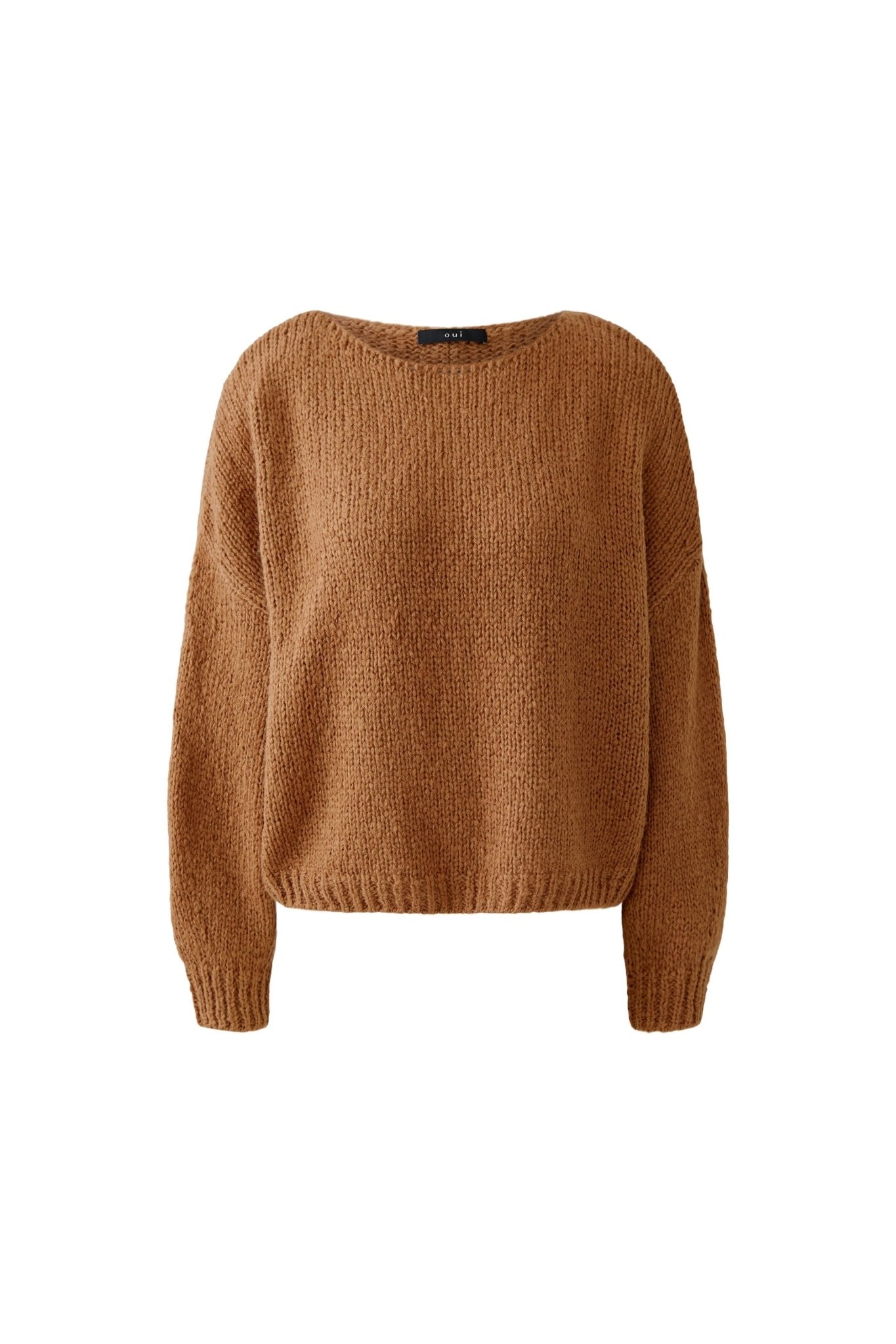 This warm brown jumper combines a modern oversized silhouette with a super soft blend of wool and mohair, giving a smooth knit that feels gentle against the skin. Features like a scoop neckline, dropped shoulders, ribbed cuffs, and a decorative seam down the back centre add subtle details. Perfect for pairing with denim or adding a cosy touch to a faux leather skirt and boots, this jumper offers versatile comfort with a chic edge.