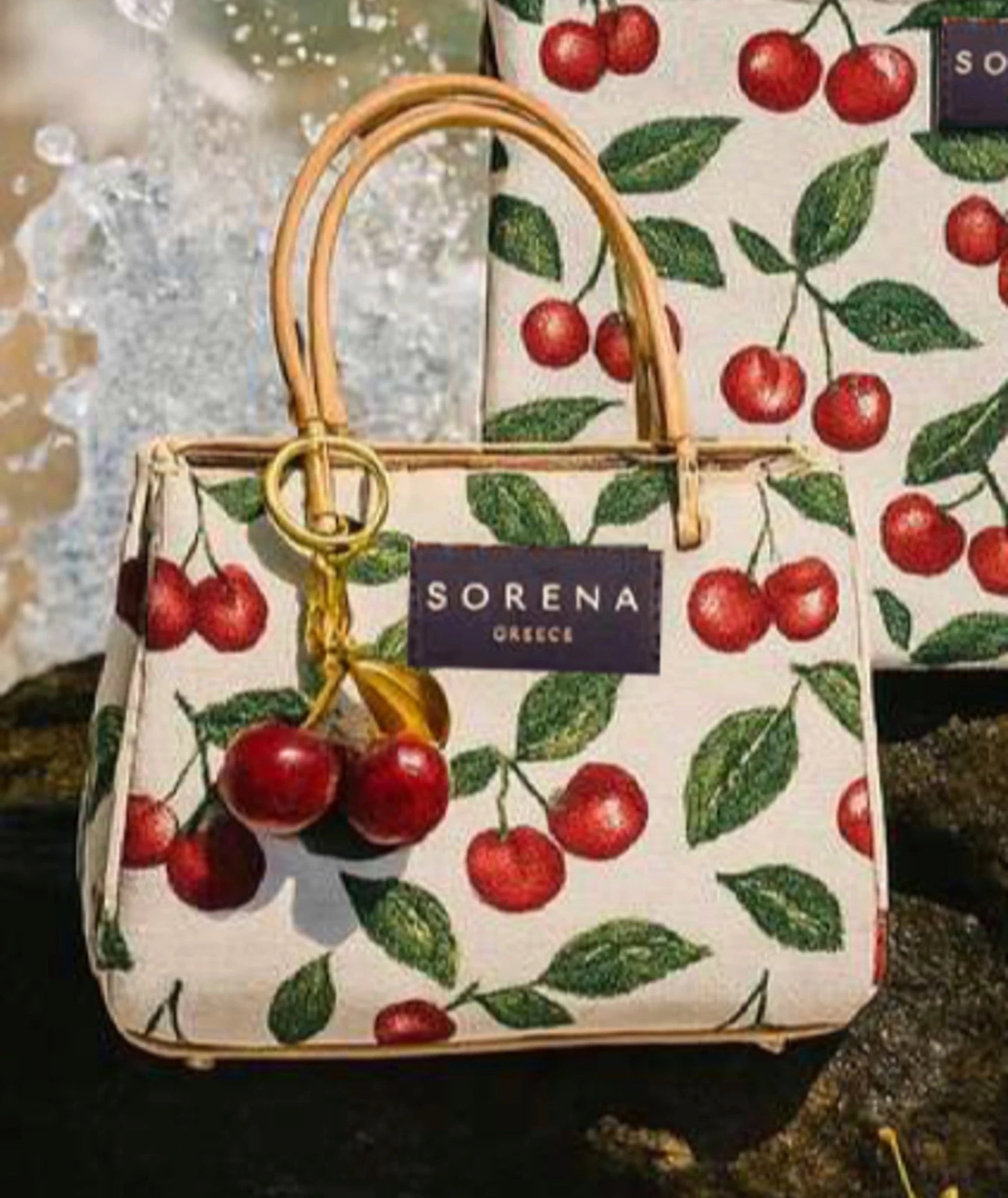 This handcrafted statement piece effortlessly transitions from day to night. The Galleria bag features exquisite cherry woven fabric in red, green, and beige, paired with a detachable double cherry charm and gold chain shoulder strap that adds a playful touch to your ensemble. Handcrafted from 100% woven cotton in Greece, it combines elegance with individuality for the confident wearer.