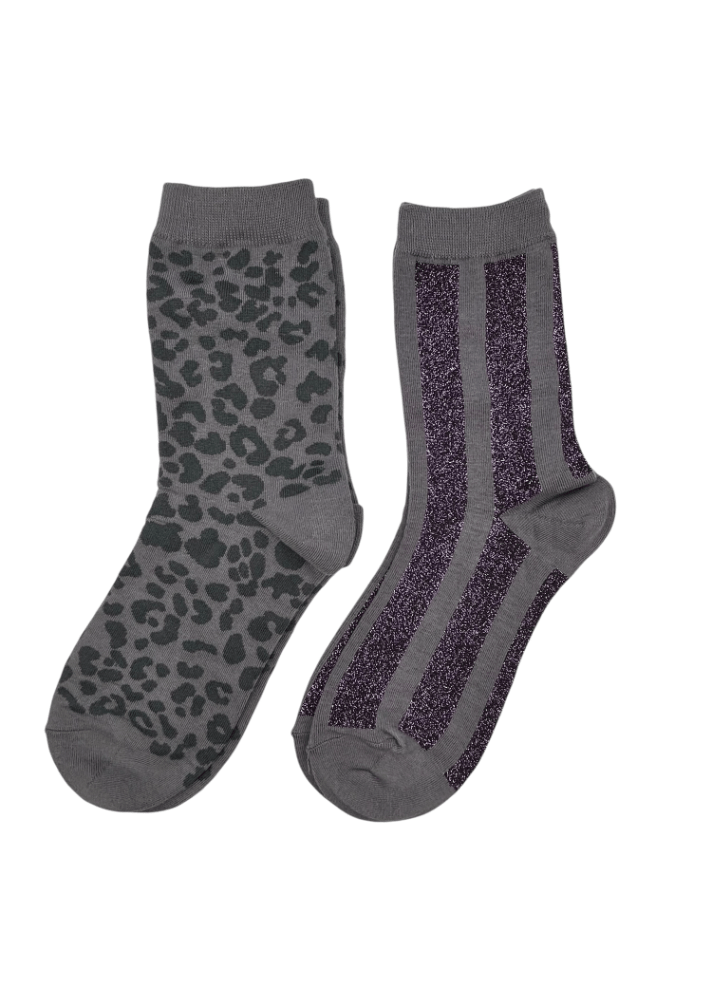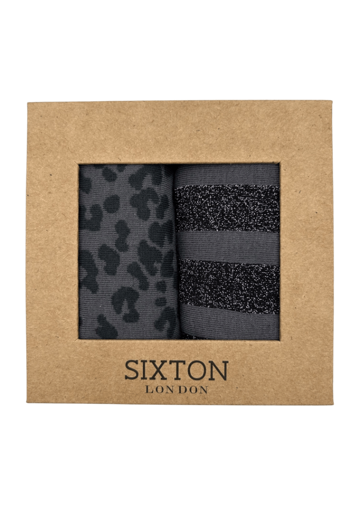 Discover the perfect pairing with this Sixton London sock duo, beautifully presented in a gift box. The set combines two distinctive styles: charcoal grey socks adorned with a bold leopard print for a touch of wild flair, paired with the 'Berlin' design featuring eye-catching lurex stripes for added sparkle. Ideal for those who love mixing pattern and texture, this combination brings versatility and style to your everyday essentials. A wonderful gift choice for the fashion-forward sock enthusiast.