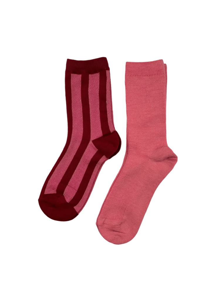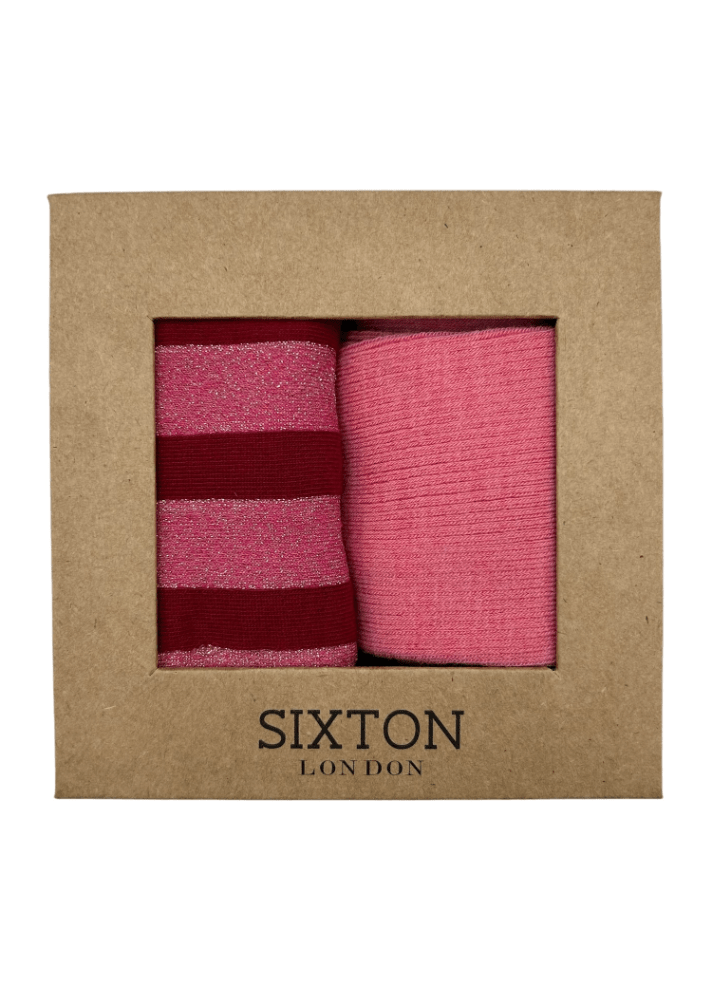 Treat your feet to luxury with this charming sock duo from Sixton London. The set includes two pairs: vibrant red and pink striped 'Berlin' socks featuring eye-catching sparkly lurex for a touch of glamour, paired with elegant plain pink 'Barcelona' socks. Beautifully presented in a gift box, this collection offers versatile style for everyday wear or the perfect present for someone special. Comfort meets sophistication in every step.