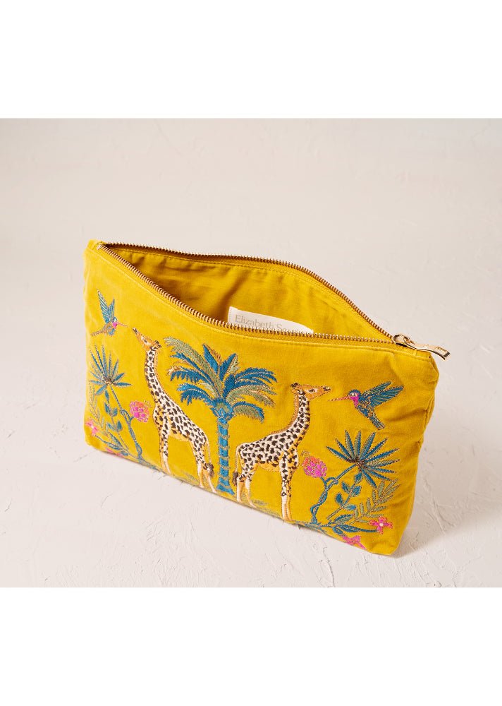 Bring African inspired elegance to your everyday carry with this exquisite Elizabeth Scarlett pouch. Featuring hand illustrated embroidery of a graceful giraffe set against lush savannah foliage, rendered in rich mustard yellow tones. Crafted from luxuriously soft 100% cotton velvet with a coordinating cotton lining, it combines beauty with practicality. The secure gold zip closure and reversible design make it ideal for storing essentials, slipping into your handbag, or carrying as a standalone clutch.